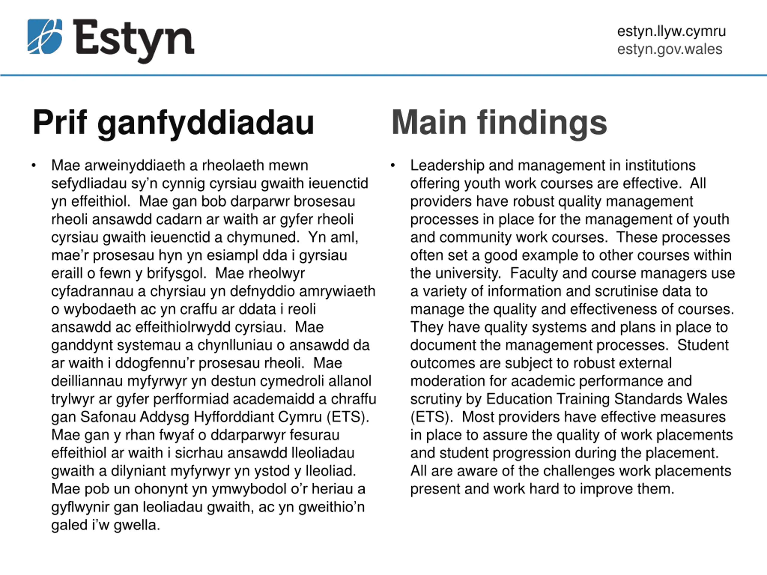 estyn.llyw.cymru estyn.gov.wales Prif ganfyddiadau Main findings Mae arweinyddiaeth a rheolaeth mewn sefydliadau sy n cynnig cyrsiau gwaith ieuenctid yn effeithiol. Mae gan bob darparwr brosesau rheoli ansawdd cadarn ar waith ar gyfer rheoli cyrsiau gwaith ieuenctid a chymuned. Yn aml, mae r prosesau hyn yn esiampl dda i gyrsiau eraill o fewn y brifysgol. Mae rheolwyr cyfadrannau a chyrsiau yn defnyddio amrywiaeth o wybodaeth ac yn craffu ar ddata i reoli ansawdd ac effeithiolrwydd cyrsiau. Mae ganddynt systemau a chynlluniau o ansawdd da ar waith i ddogfennu r prosesau rheoli. Mae deilliannau myfyrwyr yn destun cymedroli allanol trylwyr ar gyfer perfformiad academaidd a chraffu gan Safonau Addysg Hyfforddiant Cymru (ETS). Mae gan y rhan fwyaf o ddarparwyr fesurau effeithiol ar waith i sicrhau ansawdd lleoliadau gwaith a dilyniant myfyrwyr yn ystod y lleoliad. Mae pob un ohonynt yn ymwybodol o r heriau a gyflwynir gan leoliadau gwaith, ac yn gweithio n galed i w gwella. Leadership and management in institutions offering youth work courses are effective. All providers have robust quality management processes in place for the management of youth and community work courses. These processes often set a good example to other courses within the university. Faculty and course managers use a variety of information and scrutinise data to manage the quality and effectiveness of courses. They have quality systems and plans in place to document the management processes. Student outcomes are subject to robust external moderation for academic performance and scrutiny by Education Training Standards Wales (ETS). Most providers have effective measures in place to assure the quality of work placements and student progression during the placement. All are aware of the challenges work placements present and work hard to improve them.