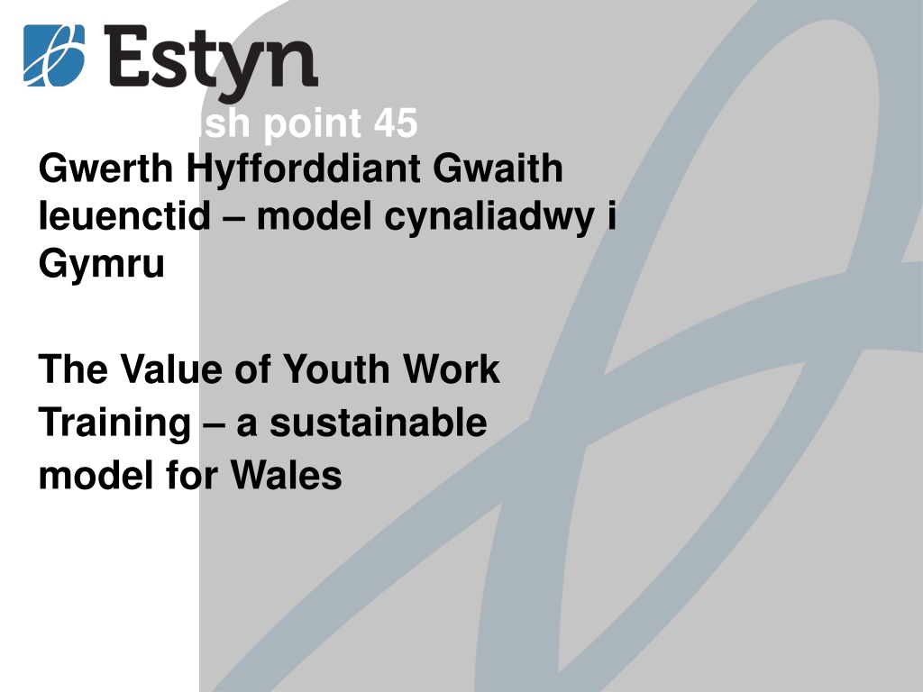 Title Welsh point 45 Gwerth Hyfforddiant Gwaith Ieuenctid model cynaliadwy i Gymru The Value of Youth Work Training a sustainable model for Wales