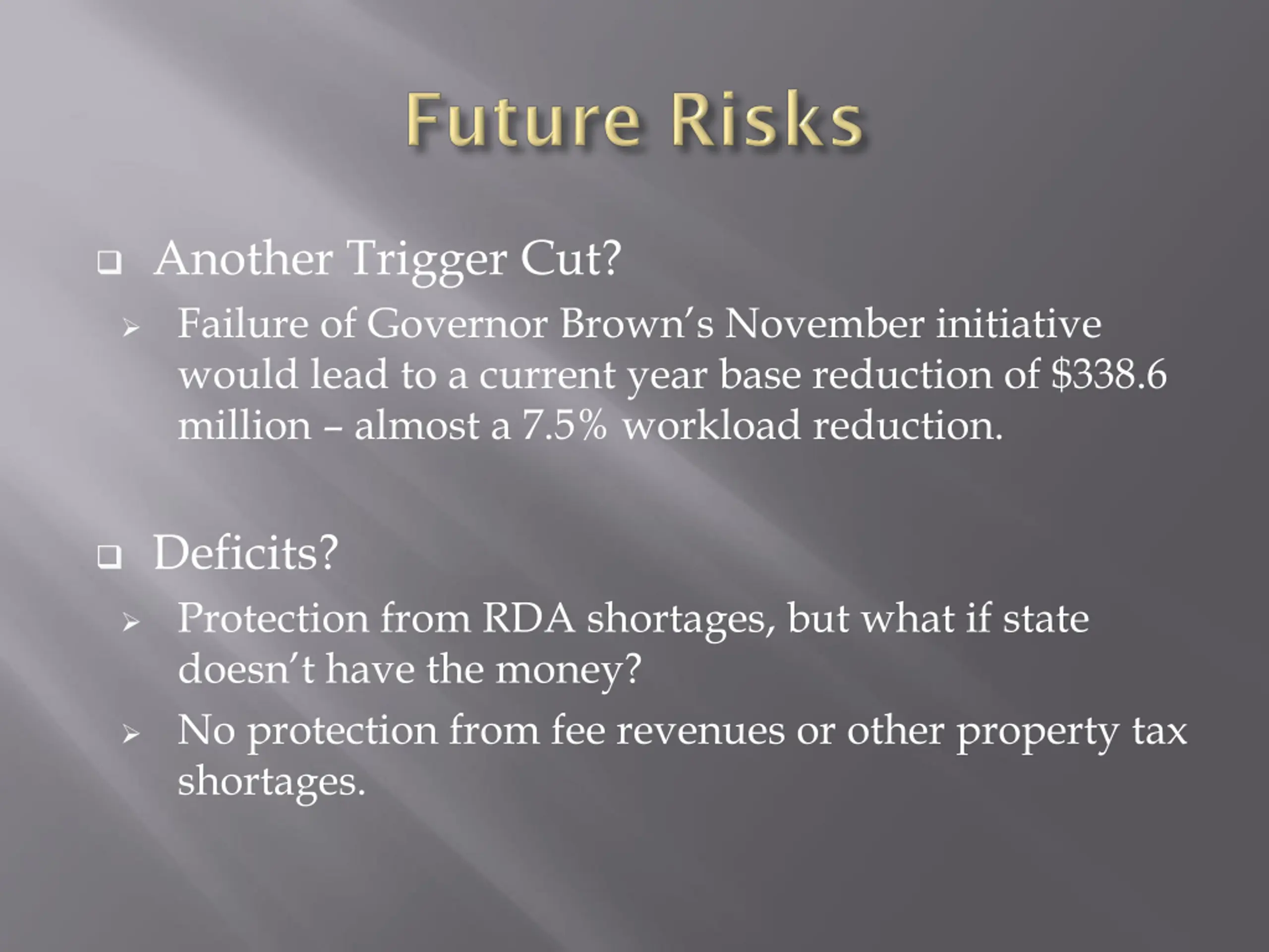 Another Trigger Cut? Failure of Governor Brown s November initiative would lead to a current year base reduction of $338.6 million almost a 7.5% workload reduction. Deficits? Protection from RDA shortages, but what if state doesn t have the money? No protection from fee revenues or other property tax shortages.