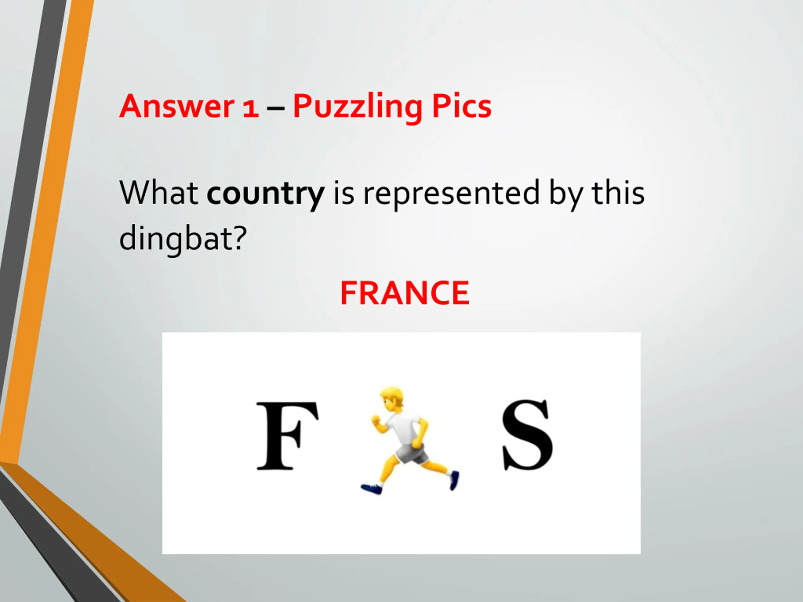 Answer 1 Puzzling Pics What country is represented by this dingbat? FRANCE