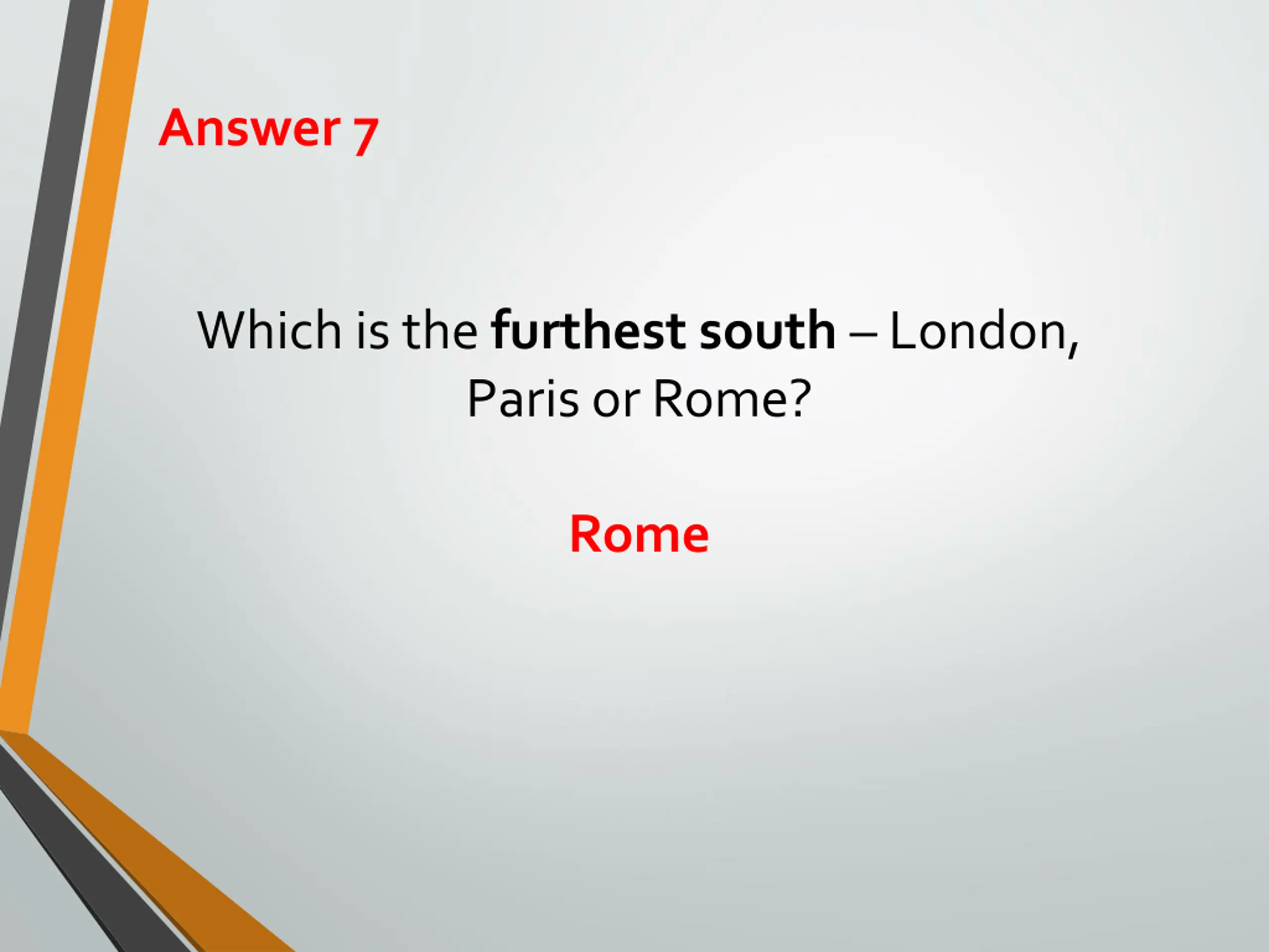Question 7 Geography Which is the furthest south London, Paris or Rome?