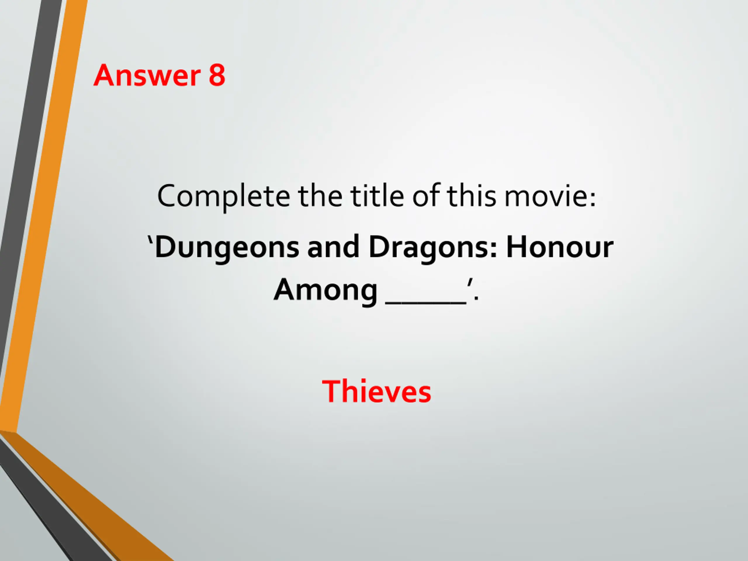 Answer 8 Complete the title of this movie: Dungeons and Dragons: Honour Among _____ . Thieves