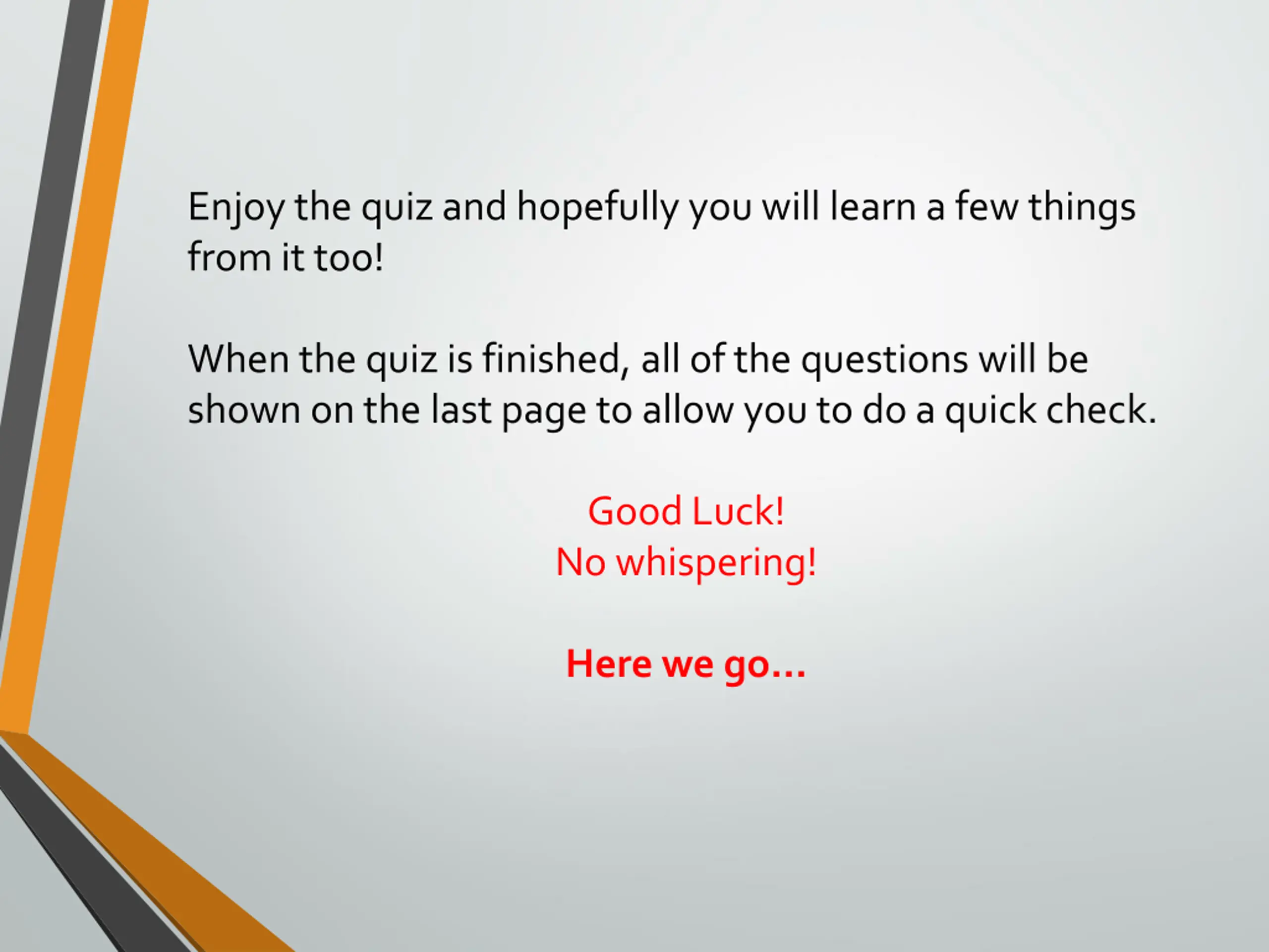 Enjoy the quiz and hopefully you will learn a few things from it too! When the quiz is finished, all of the questions will be shown on the last page to allow you to do a quick check. Good Luck! No whispering! Here we go