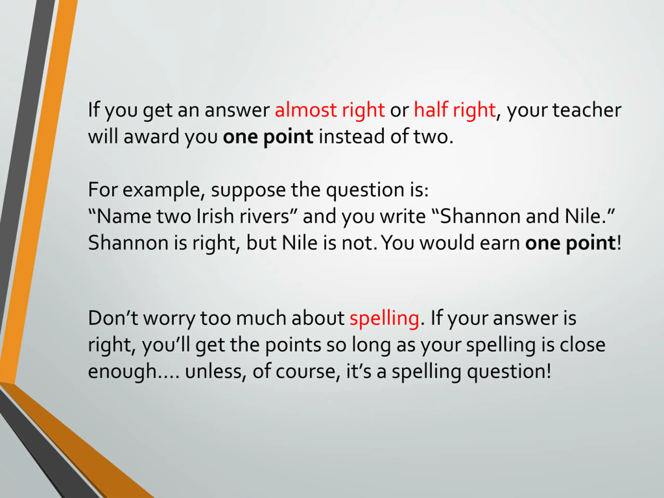If you get an answer almost right or half right, your teacher will award you one point instead of two. For example, suppose the question is: Name two Irish rivers and you write Shannon and Nile. Shannon is right, but Nile is not. You would earn one point! Don t worry too much about spelling. If your answer is right, you ll get the points so long as your spelling is close enough . unless, of course, it s a spelling question!