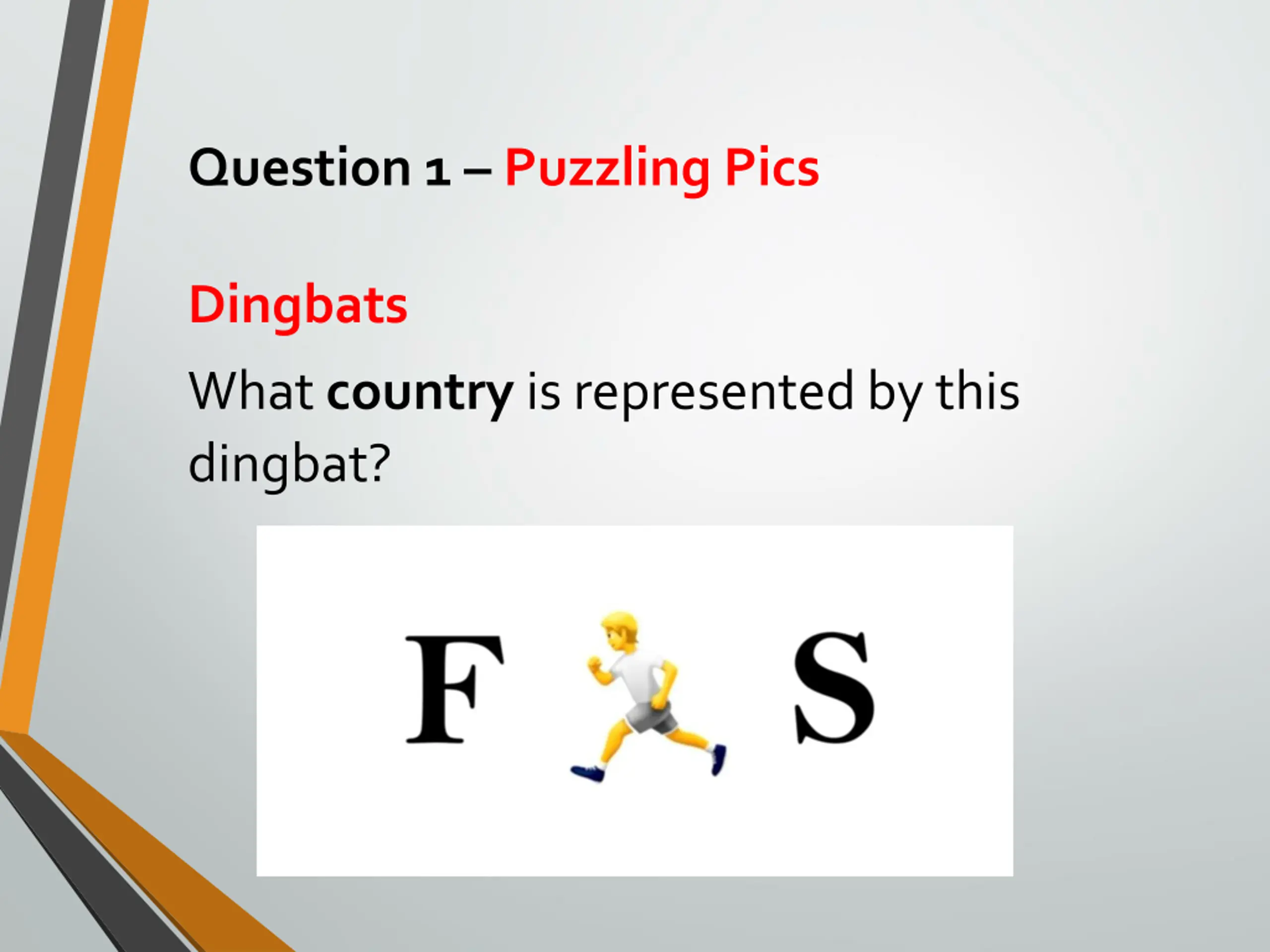 Question 1 Puzzling Pics Dingbats What country is represented by this dingbat?