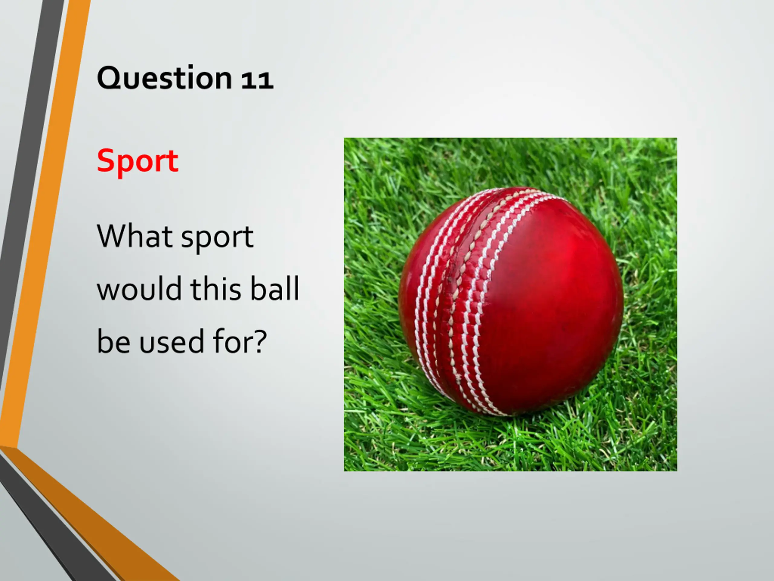 Answer 11 What sport would this ball be used for? Cricket