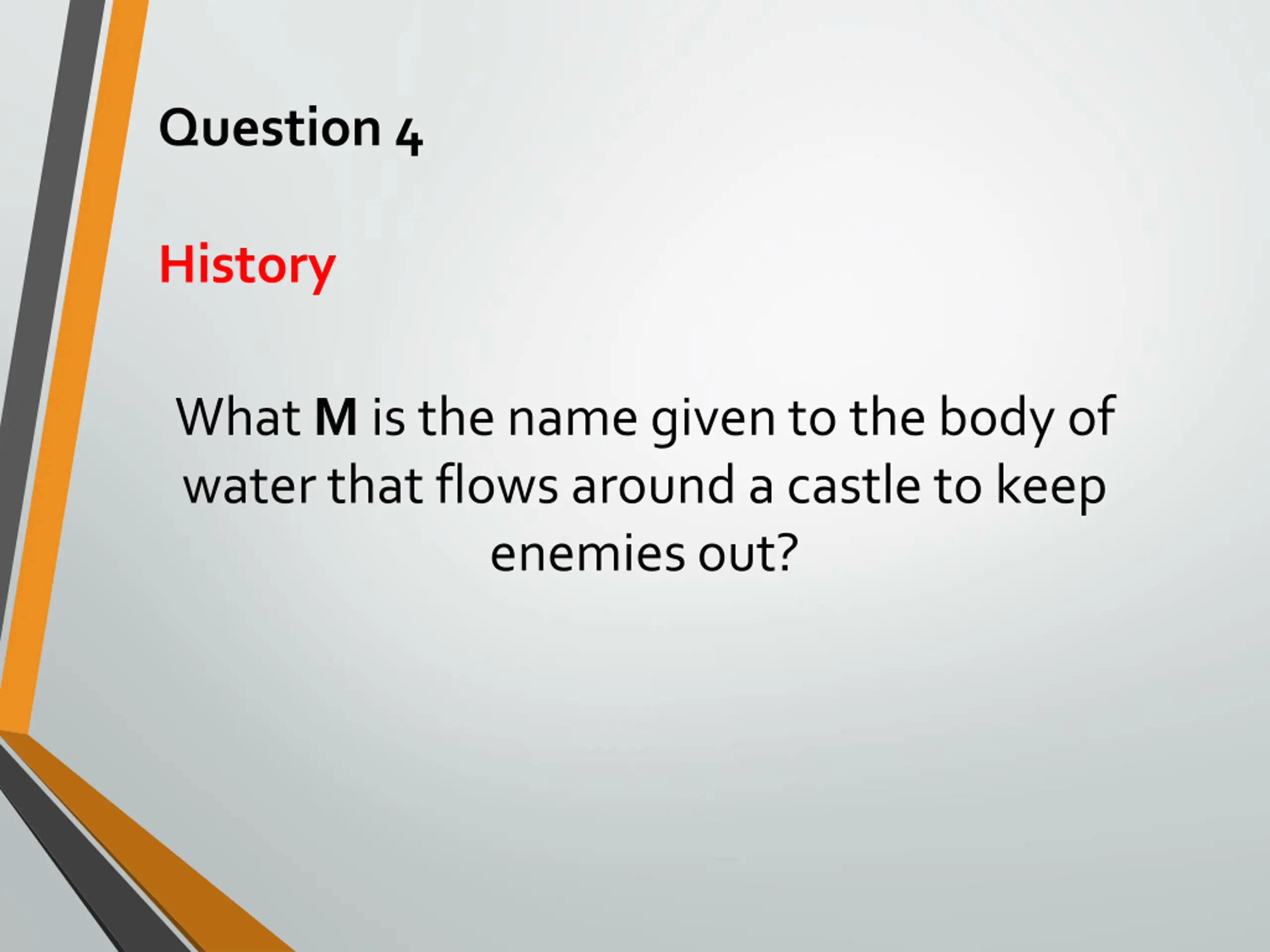 Question 4 History What M is the name given to the body of water that flows around a castle to keep enemies out?