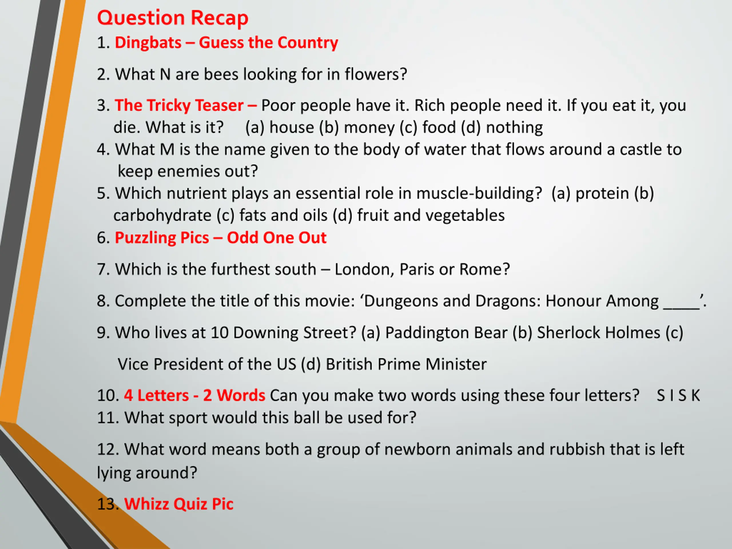 Question Recap 1. Dingbats Guess the Country 2. What N are bees looking for in flowers? 3. The Tricky Teaser Poor people have it. Rich people need it. If you eat it, you die. What is it? (a) house (b) money (c) food (d)nothing 4. What M is the name given to the body of water that flows around a castle to keep enemies out? 5. Which nutrient plays an essential role in muscle-building? (a) protein (b) carbohydrate (c) fats and oils (d) fruit and vegetables 6. Puzzling Pics Odd One Out 7.Which is the furthest south London, Paris or Rome? 8. Complete the title of this movie: Dungeons and Dragons: Honour Among ____ . 9. Who lives at 10 Downing Street? (a) Paddington Bear (b) Sherlock Holmes (c) Vice President of the US (d) British Prime Minister 10. 4 Letters - 2 Words Can you make two words using these four letters? S I S K 11. What sport would this ball be used for? 12. What word means both a group of newborn animals and rubbish that is left lying around? 13. Whizz Quiz Pic