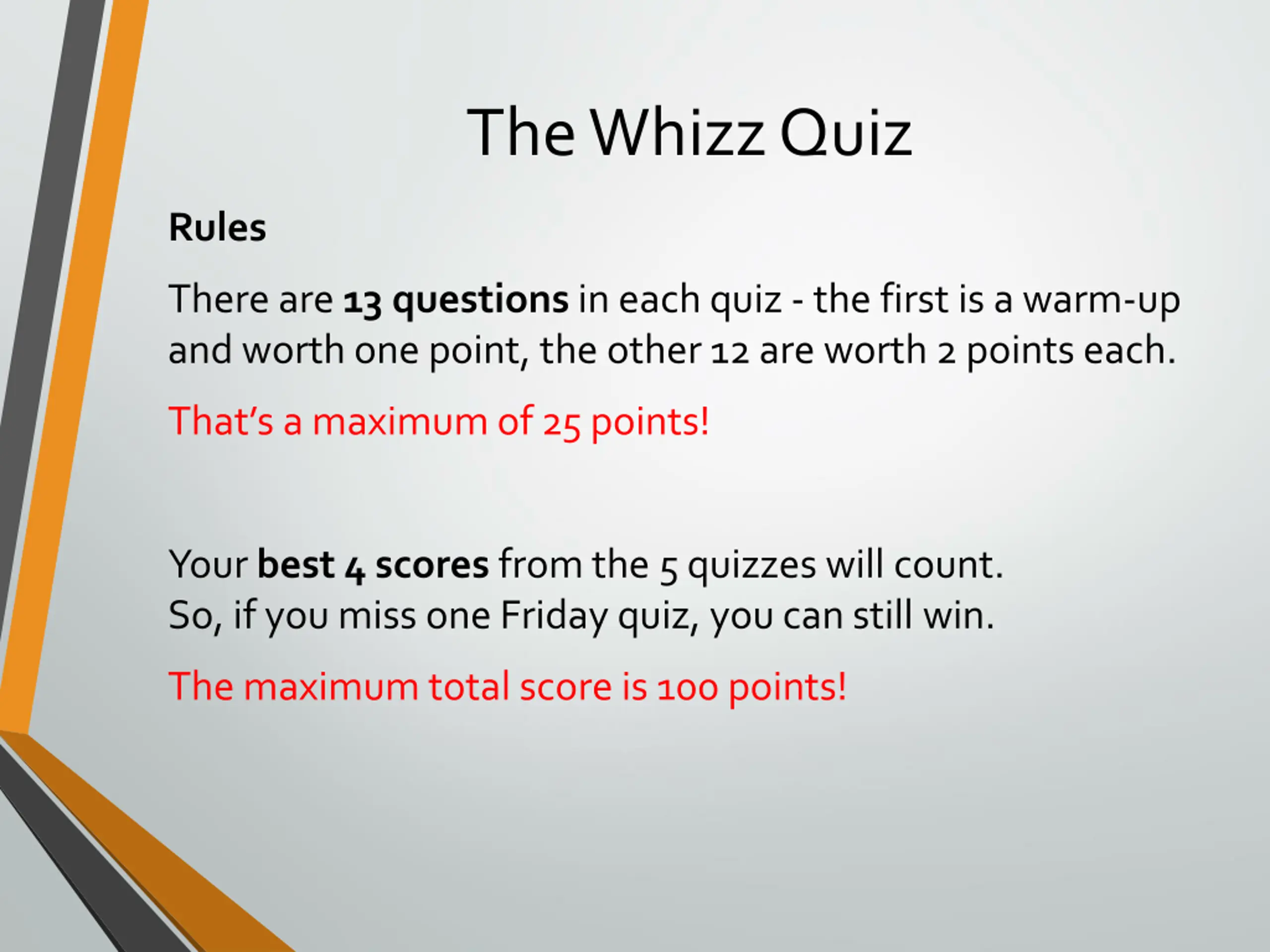 The Whizz Quiz Rules There are 13 questionsin each quiz -the first is a warm-up and worth one point, the other 12 are worth 2 points each. That s a maximum of 25 points! Your best 4 scores from the 5 quizzes will count. So, if you miss one Friday quiz, you can still win. The maximum total score is 100 points!