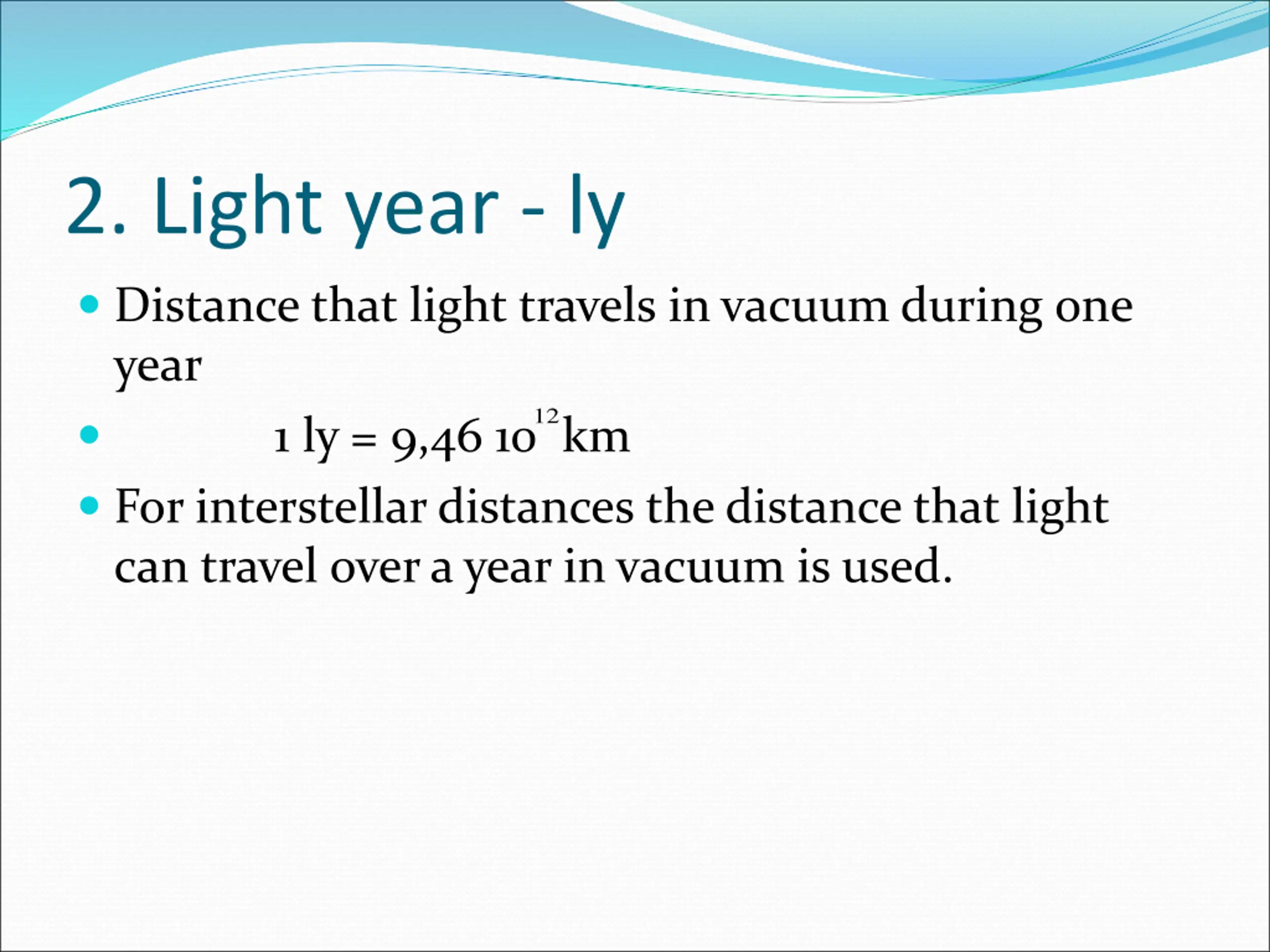 2. Light year - ly Distance that light travels in vacuum during one year 1 ly = 9,46 10 km For interstellardistances the distance that light can travel overa year in vacuum is used. 12