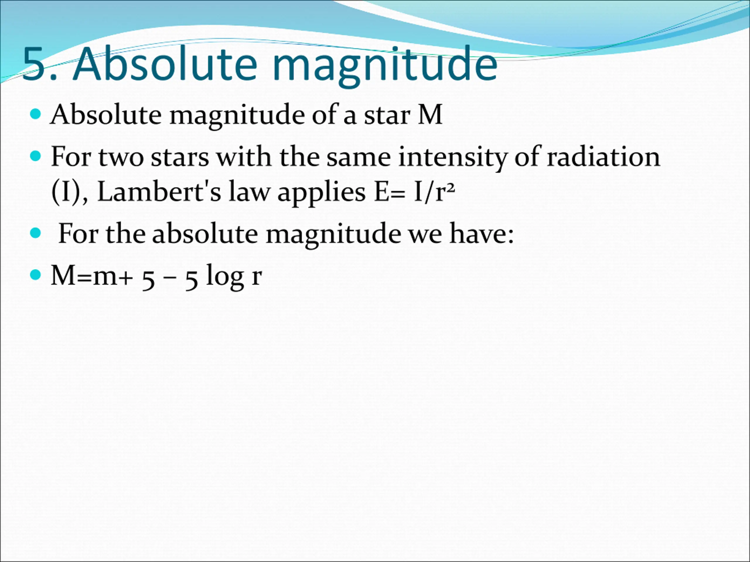 5. Absolute magnitude Absolute magnitude of a star For two stars with the same intensityof radiation (I), Lambert's law applies = I/r2 For the absolute magnitude we have: M=m+ 5 5 log r