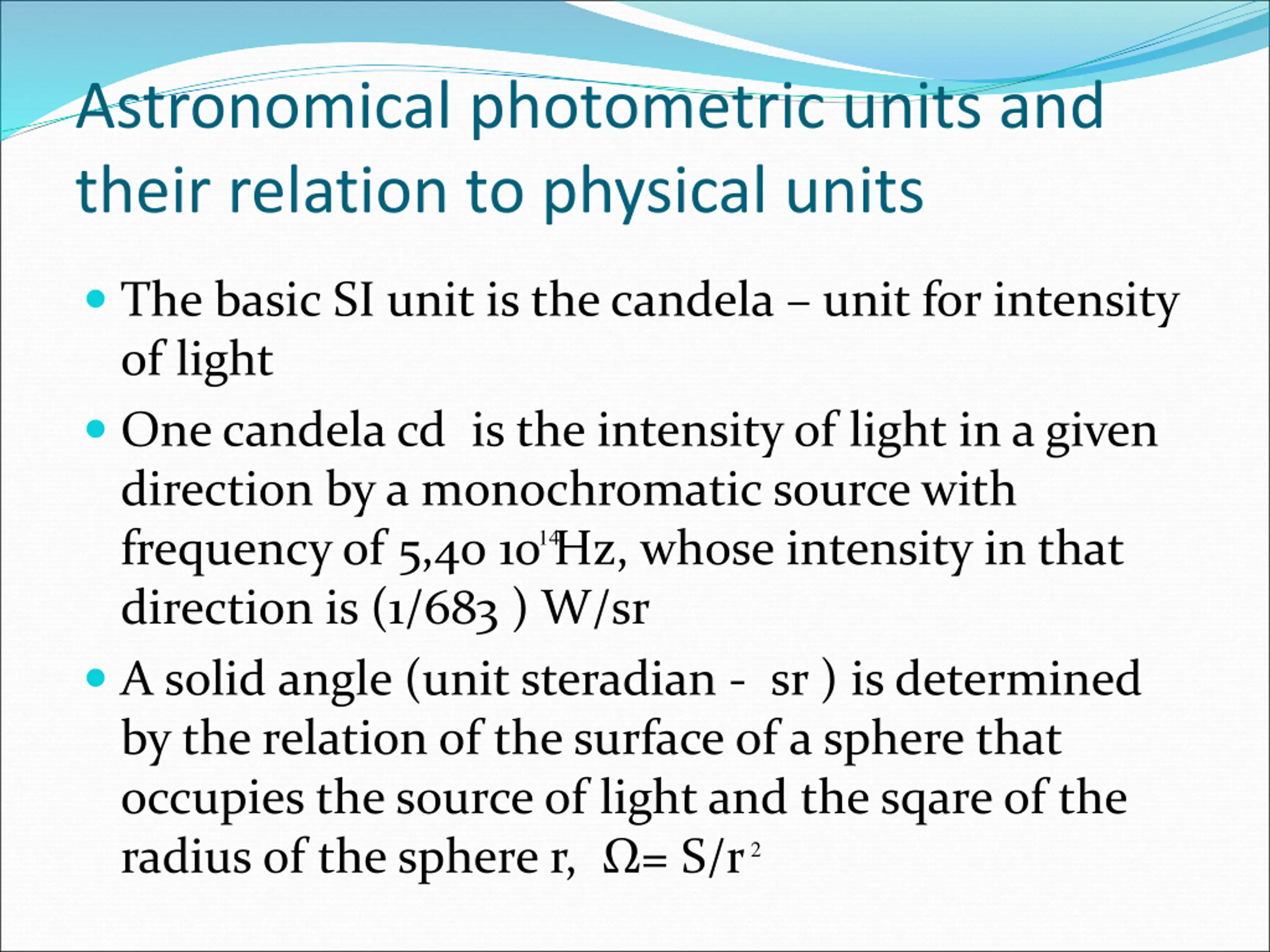 Astronomical photometric units and their relation to physical units The basic SI unit is the candela unit for intensity of light Onecandela cd is the intensityof light in a given direction by a monochromatic source with frequencyof 5,40 10 Hz, whose intensity in that direction is (1/683 ) W/sr A solid angle (unit steradian - sr ) is determined by the relation of the surface of a sphere that occupies the source of light and the sqare of the radius of the sphere r, = S/r 14 2