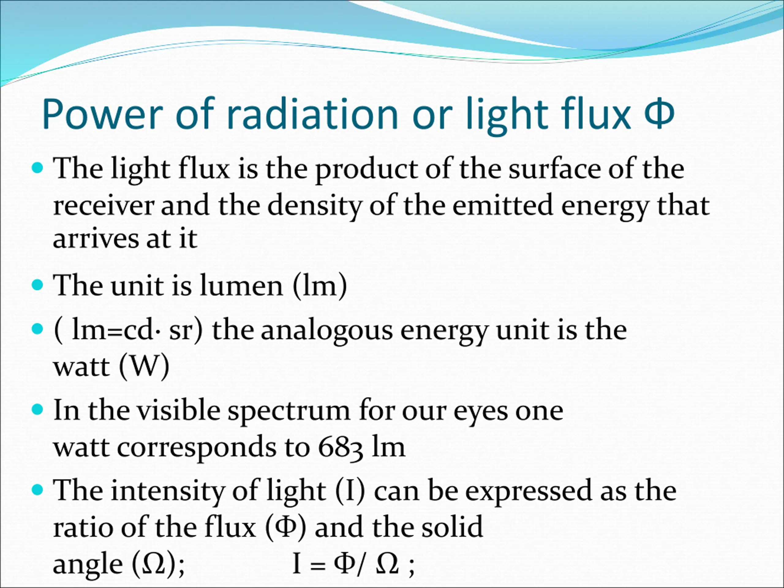 Power of radiation or light flux The light flux is the product of the surface of the receiverand the densityof the emitted energy that arrives at it The unit is lumen (lm) ( lm=cd sr) the analogous energy unit is the watt (W) In thevisible spectrum foroureyes one watt corresponds to 683 lm The intensityof light (I) can be expressed as the ratio of the flux ( ) and the solid angle ( ); I = / ;