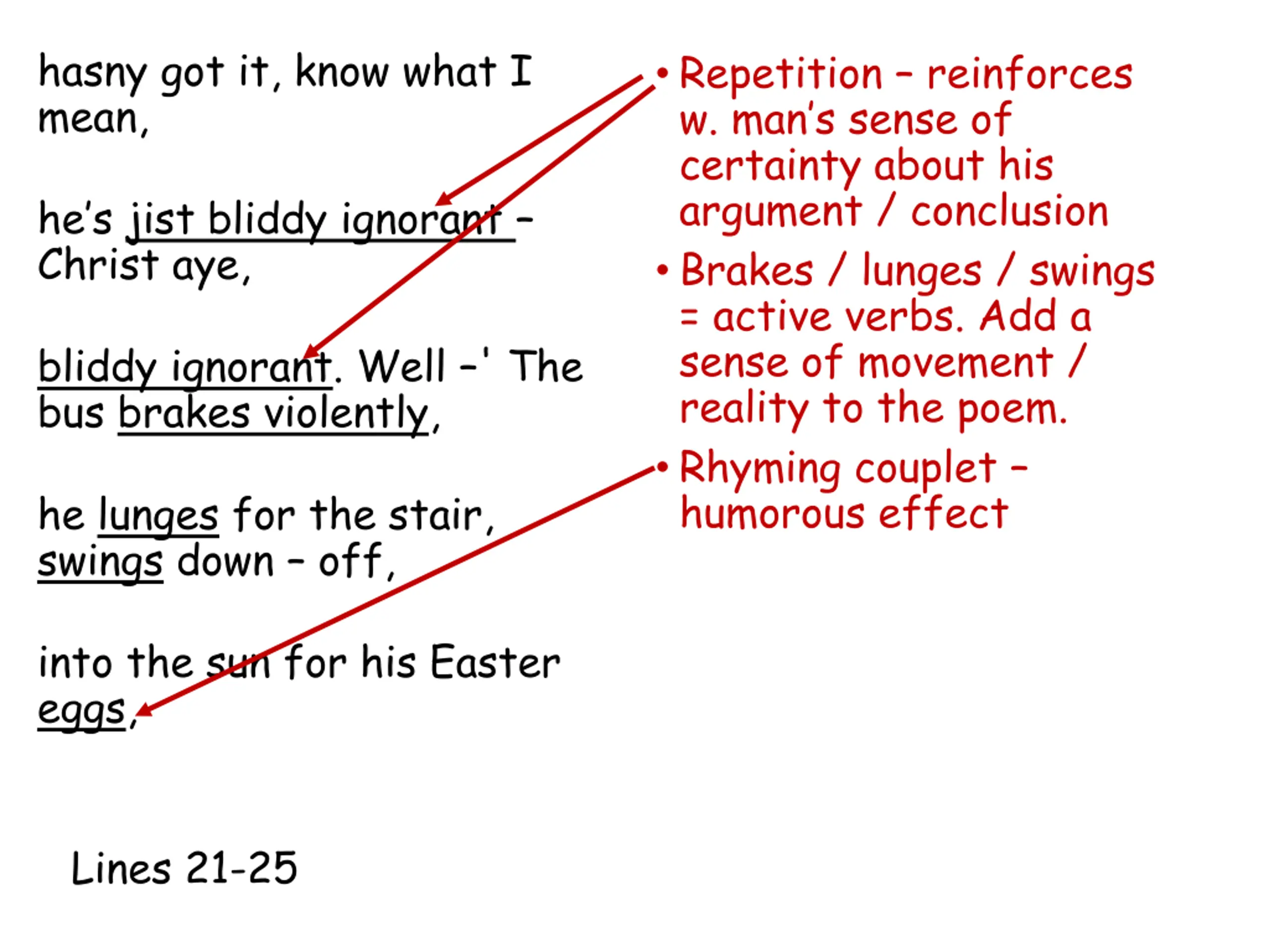 hasny got it, know what I mean, Repetition reinforces w. man s sense of certainty about his argument / conclusion Brakes / lunges / swings = active verbs. Add a sense of movement / reality to the poem. Rhyming couplet humorous effect he s jist bliddy ignorant Christ aye, bliddy ignorant. Well ' The bus brakes violently, he lunges for the stair, swings down off, into the sun for his Easter eggs, Lines 21-25