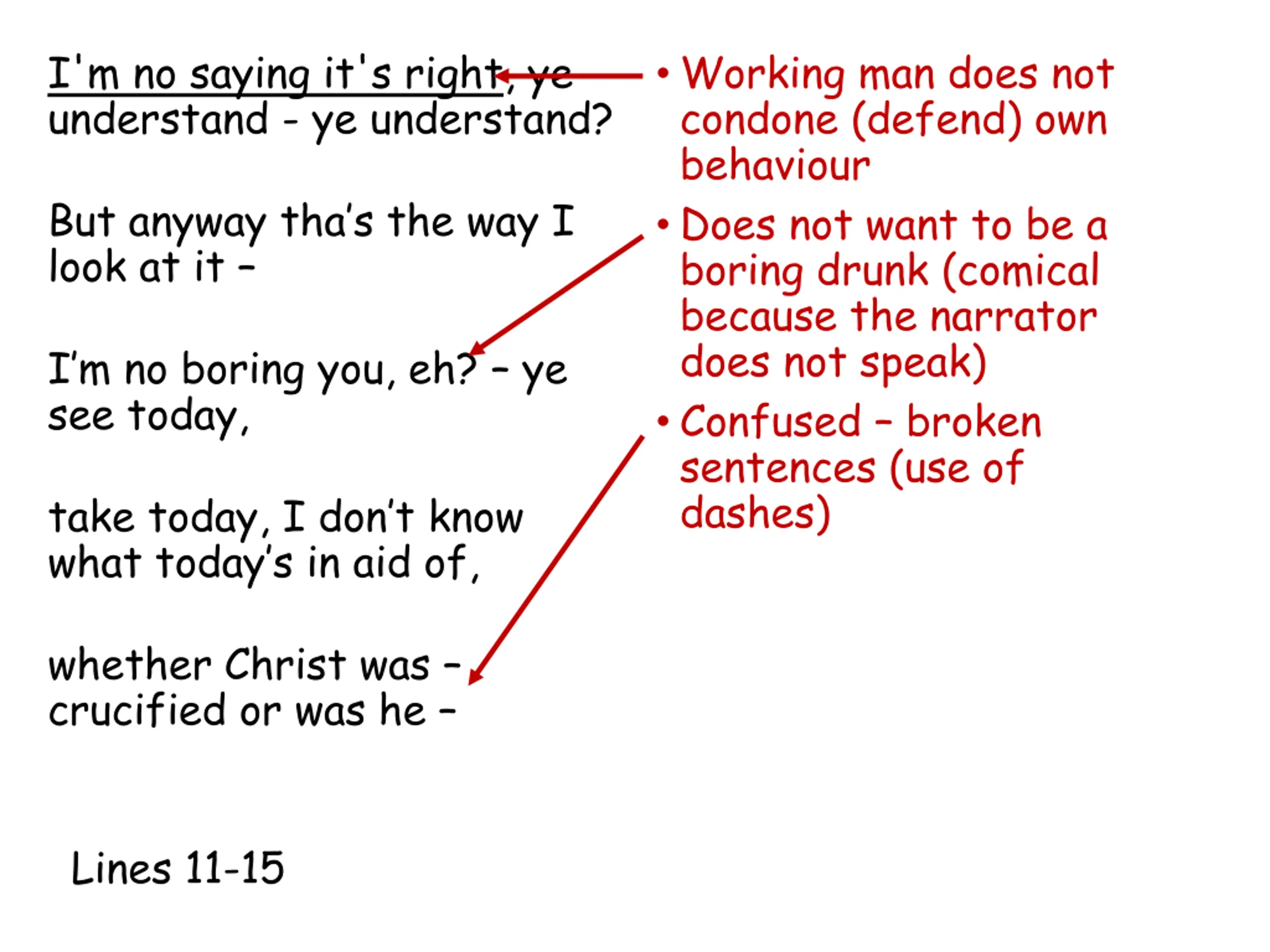 I'm no saying it's right, ye understand - ye understand? Working man does not condone (defend) own behaviour Does not want to be a boring drunk (comical because the narrator does not speak) Confused broken sentences (use of dashes) But anyway tha s the way I look at it I m no boring you, eh? ye see today, take today, I don t know what today s in aid of, whether Christ was crucified or was he Lines 11-15