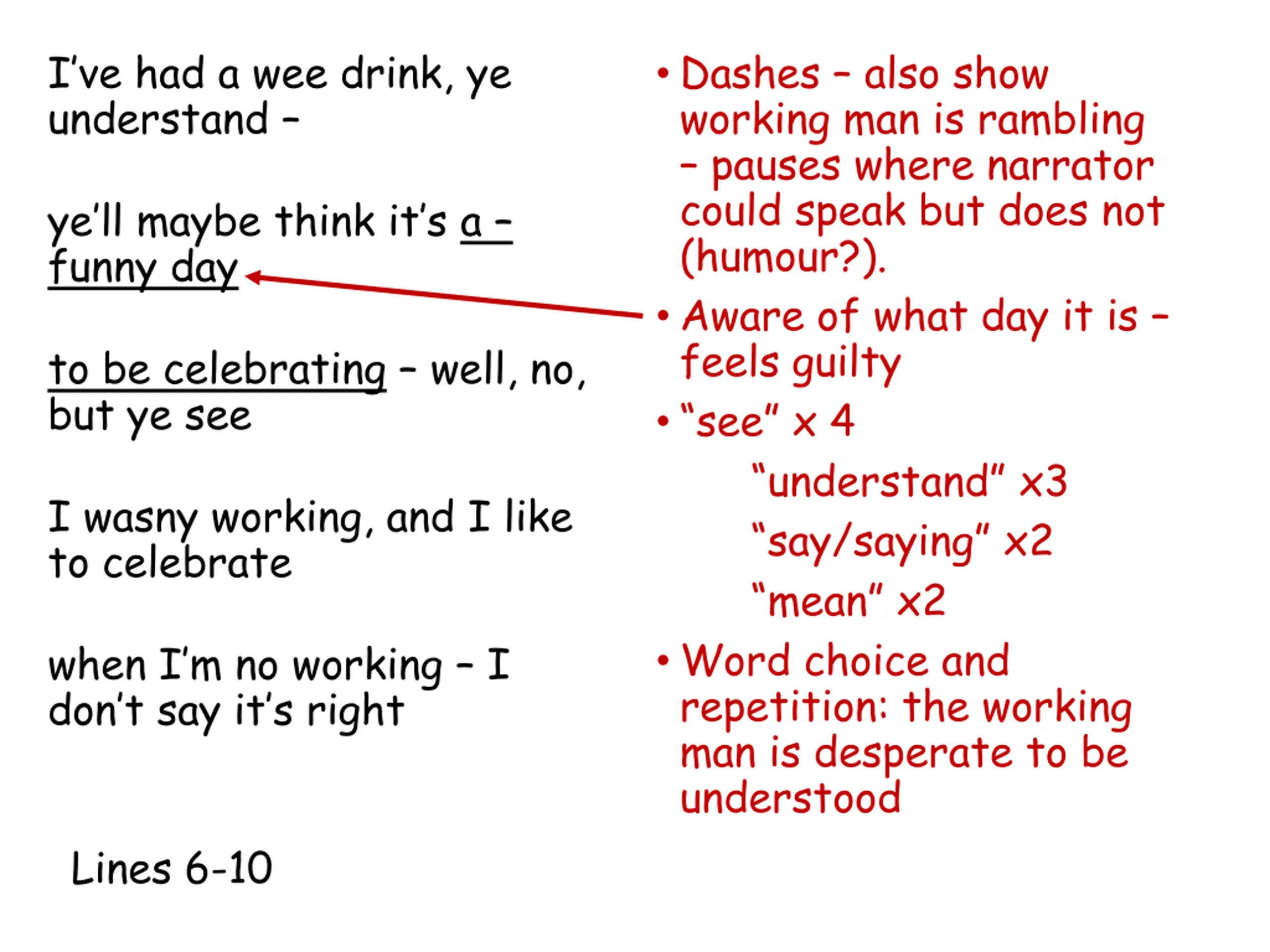 Ive had a wee drink, ye understand Dashes also show working man is rambling pauses where narrator could speak but does not (humour?). Aware of what day it is feels guilty see x 4 understand x3 say/saying x2 mean x2 Word choice and repetition: the working man is desperate to be understood ye ll maybe think it s a funny day to be celebrating well, no, but ye see I wasny working, and I like to celebrate when I m no working I don t say it s right Lines 6-10