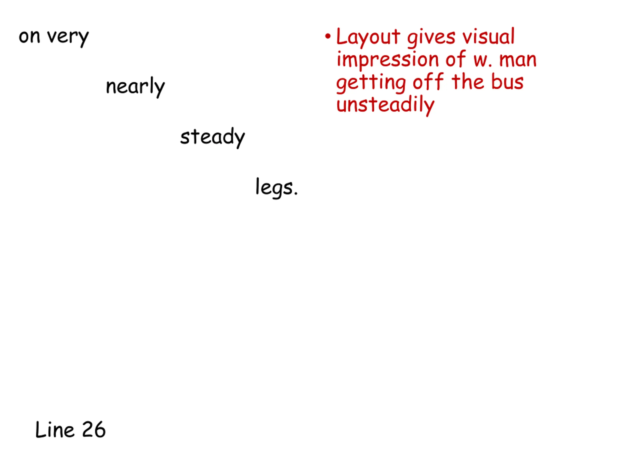 on very Layout gives visual impression of w. man getting off the bus unsteadily nearly steady legs. Line 26
