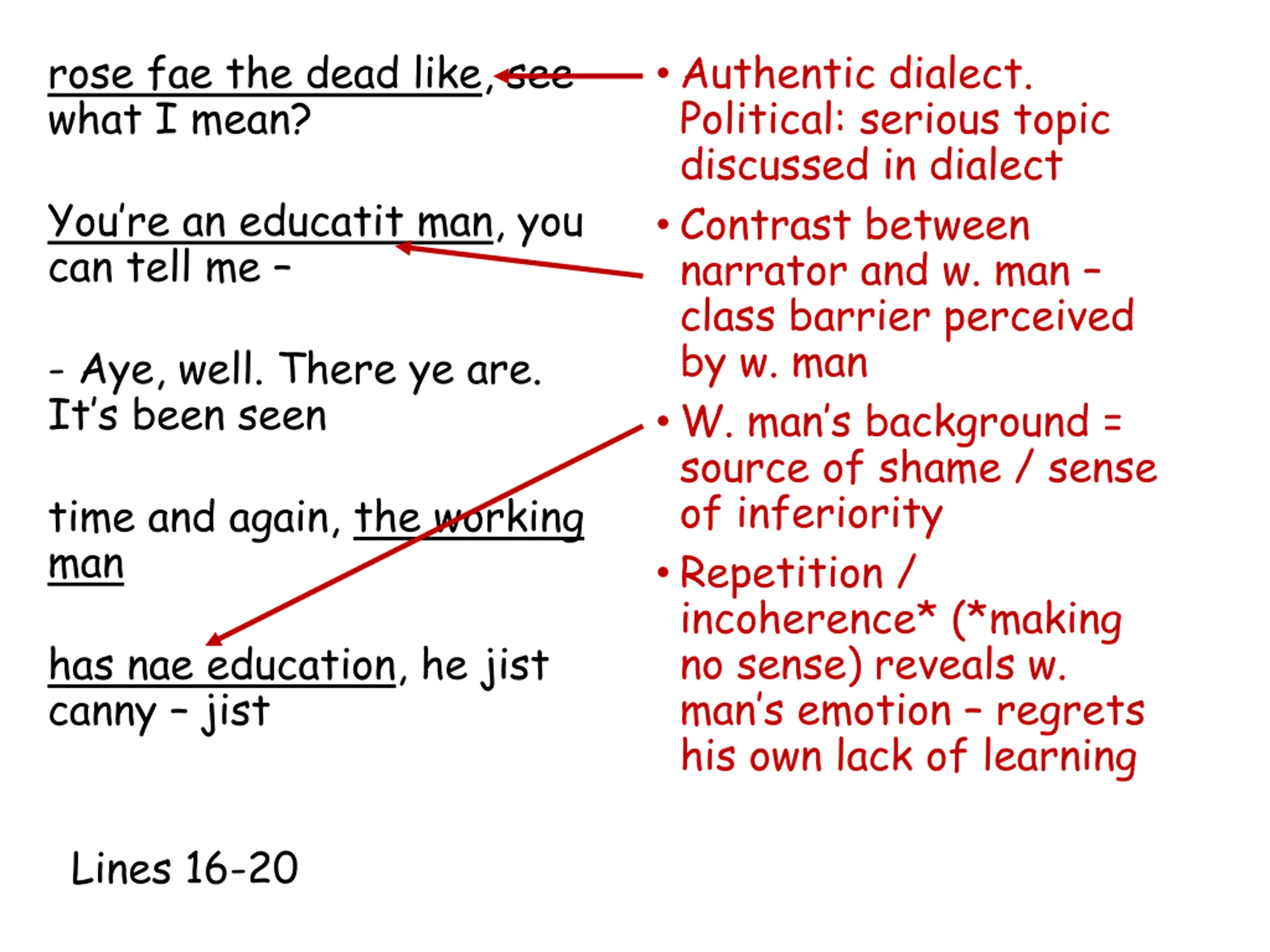 rose fae the dead like, see what I mean? Authentic dialect. Political: serious topic discussed in dialect Contrast between narrator and w. man class barrier perceived by w. man W. man s background = source of shame / sense of inferiority Repetition / incoherence* (*making no sense) reveals w. man s emotion regrets his own lack of learning You re an educatit man, you can tell me - Aye, well. There ye are. It s been seen time and again, the working man has nae education, he jist canny jist Lines 16-20