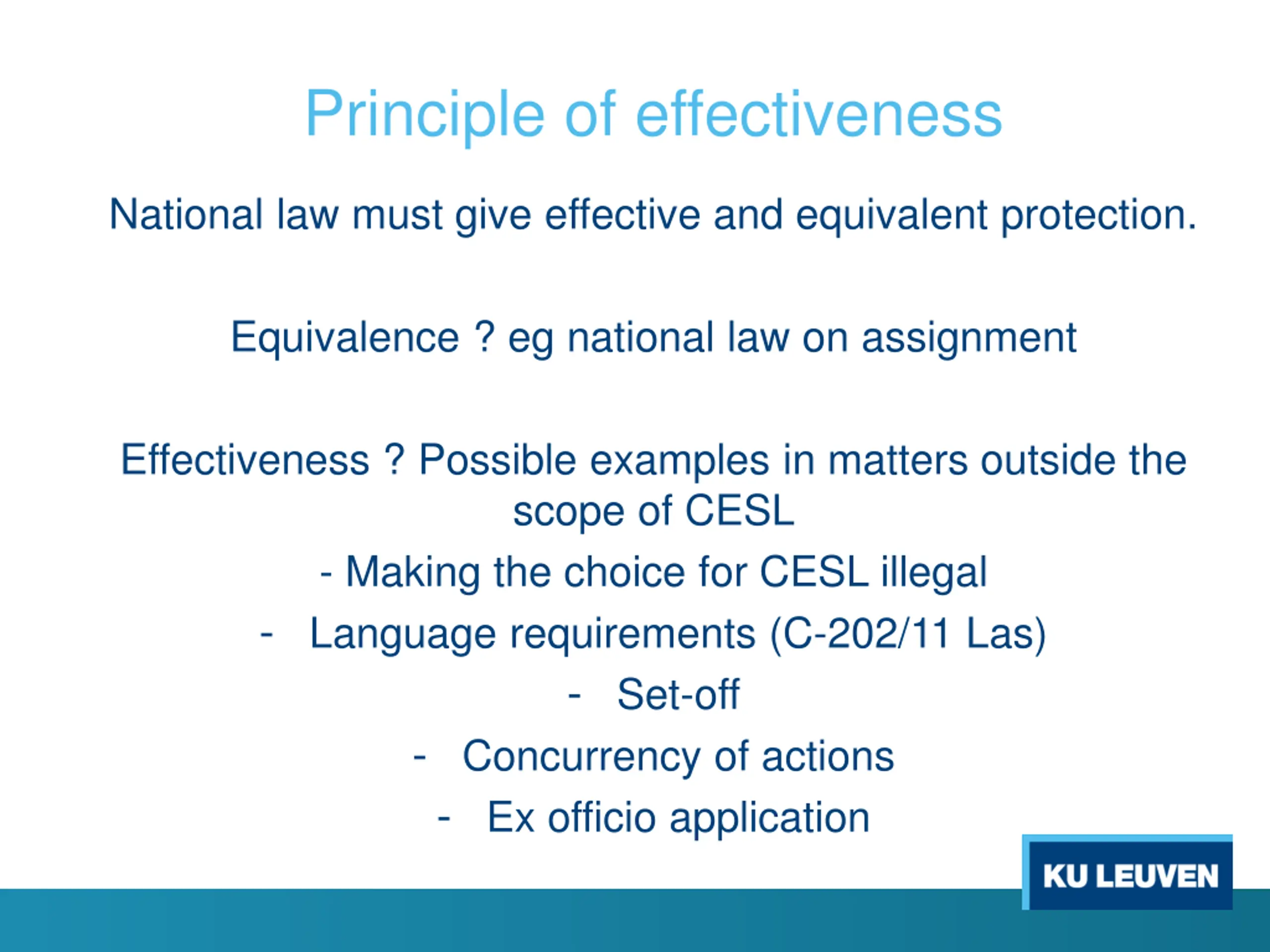 Principle of effectiveness National law must give effective and equivalent protection. Equivalence ? eg national law on assignment Effectiveness ? Possible examples in matters outside the scope of CESL - Making the choice for CESL illegal - Language requirements (C-202/11 Las) - Set-off - Concurrency of actions - Ex officio application