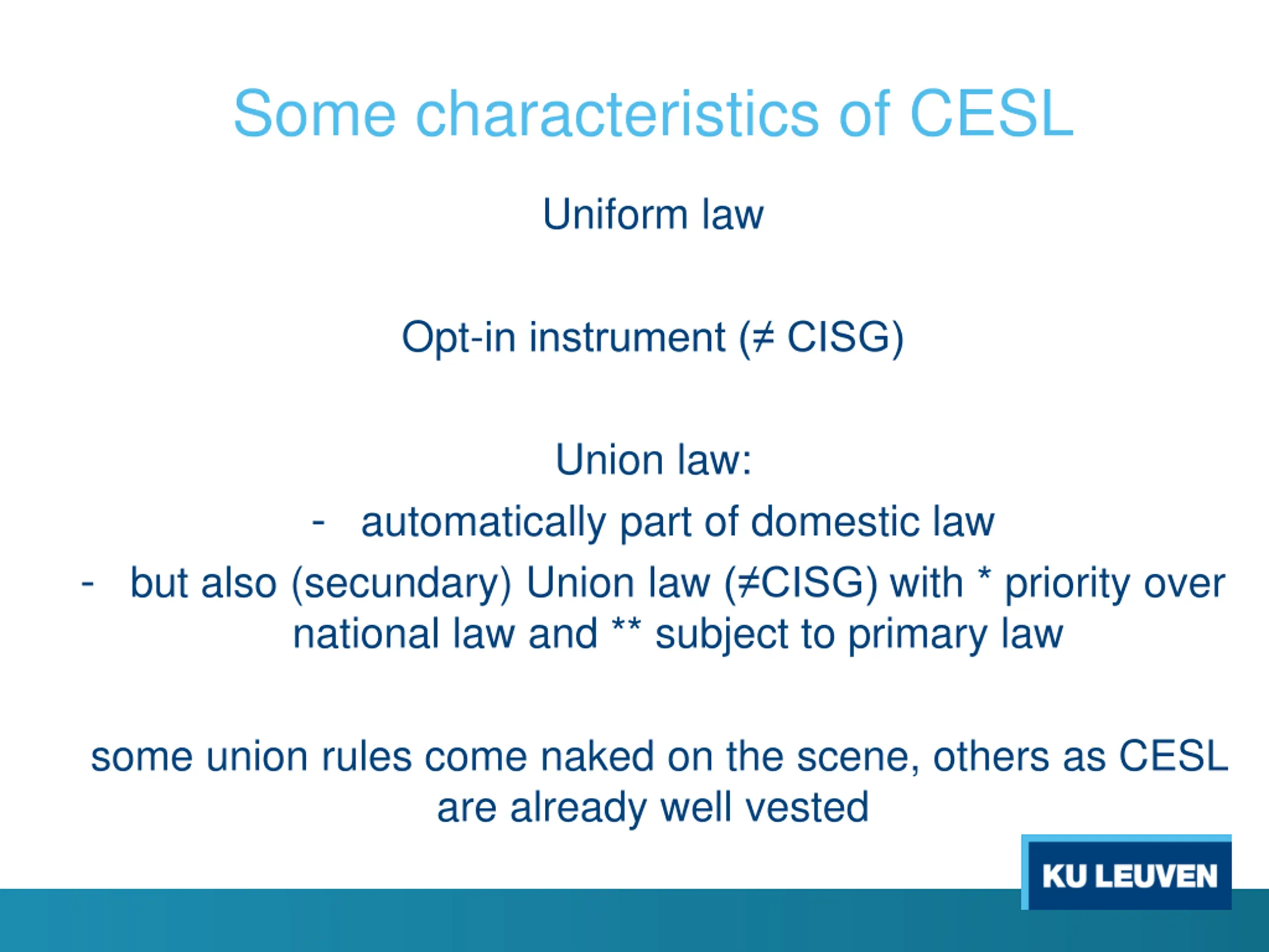 Some characteristics of CESL Uniform law Opt-in instrument ( CISG) Union law: - automatically part of domestic law - but also (secundary) Union law ( CISG) with * priority over national law and ** subject to primary law some union rules come naked on the scene, others as CESL are already well vested