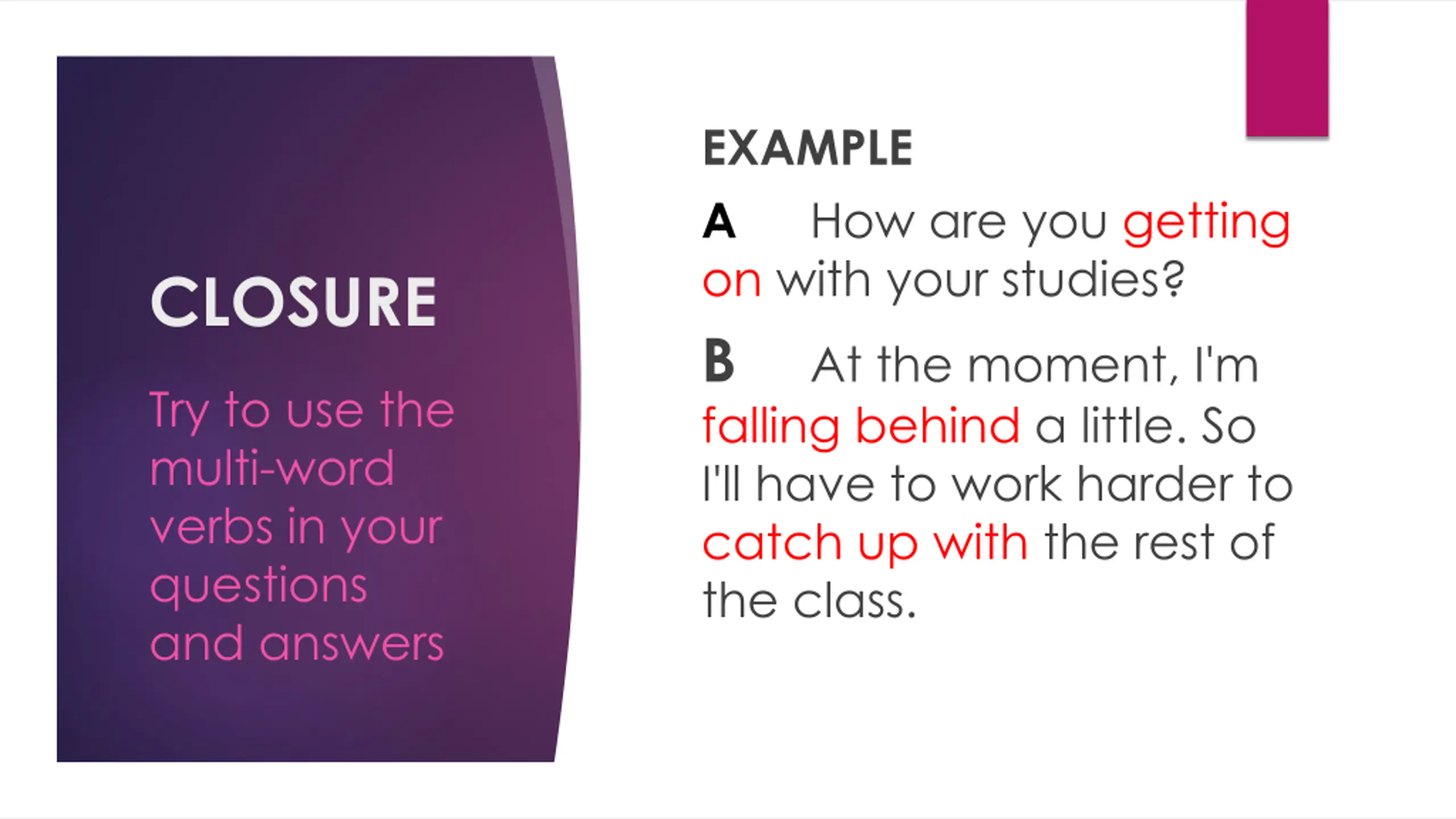 EXAMPLE A on with your studies? B At the moment, I'm falling behind a little. So I'll have to work harder to catch up with the rest of the class. How are you getting CLOSURE Try to use the multi-word verbs in your questions and answers