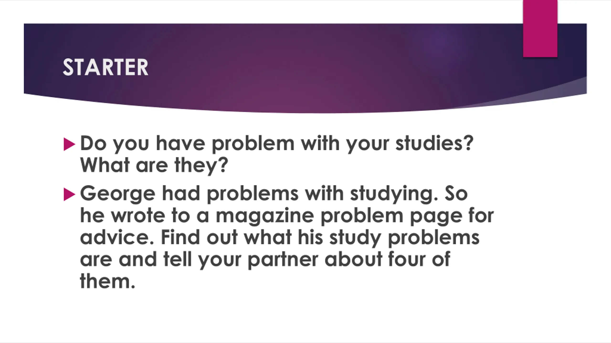 STARTER Do you have problem with your studies? What are they? George had problems with studying. So he wrote to a magazine problem page for advice. Find out what his study problems are and tell your partner about four of them.
