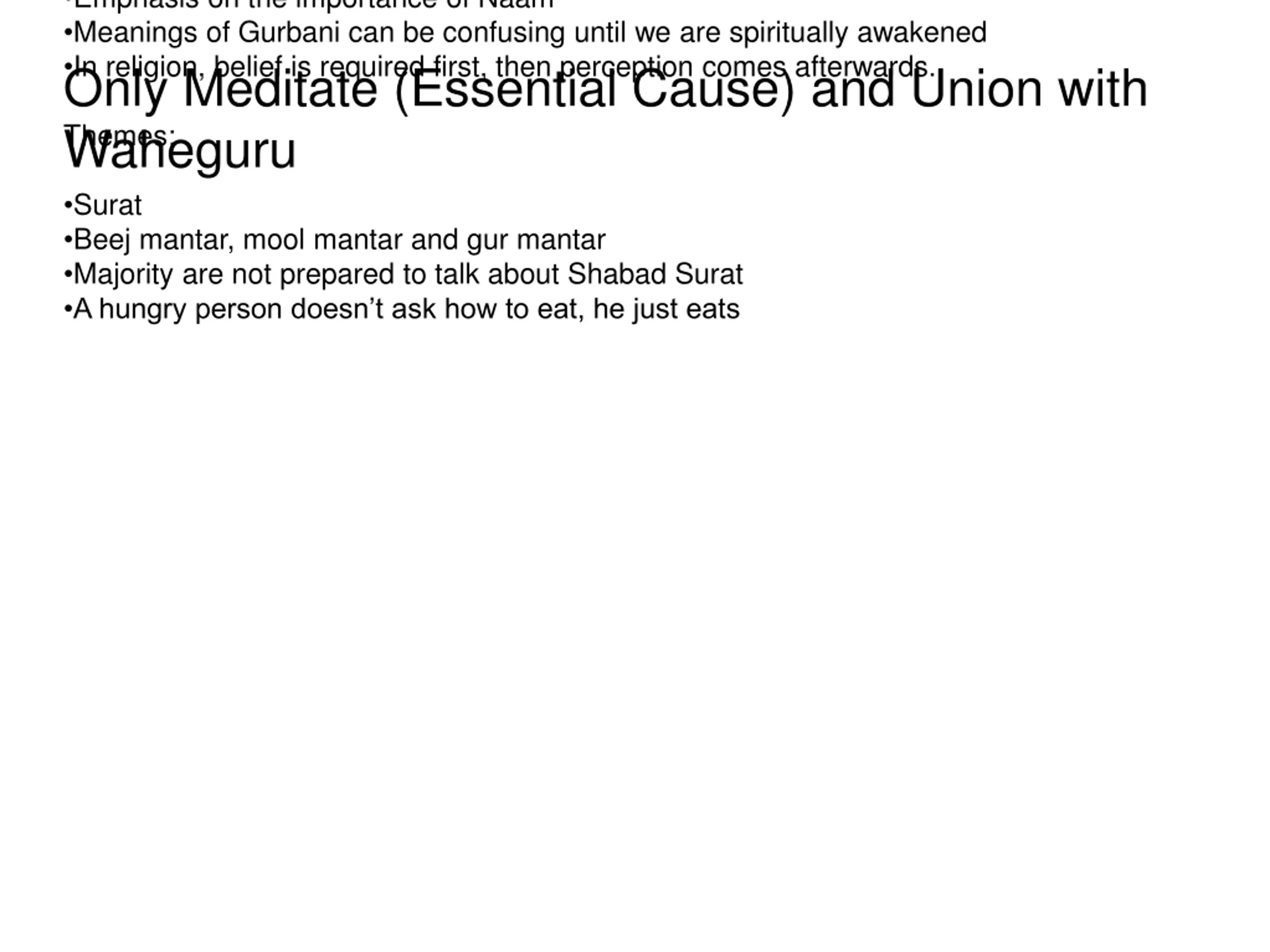 Emphasis on the importance of Naam Meanings of Gurbani can be confusing until we are spiritually awakened In religion, belief is required first, then perception comes afterwards. Only Meditate (Essential Cause) and Union with Waheguru Surat Beej mantar, mool mantar and gur mantar Majority are not prepared to talk about Shabad Surat A hungry person doesn t ask how to eat, he just eats Themes: