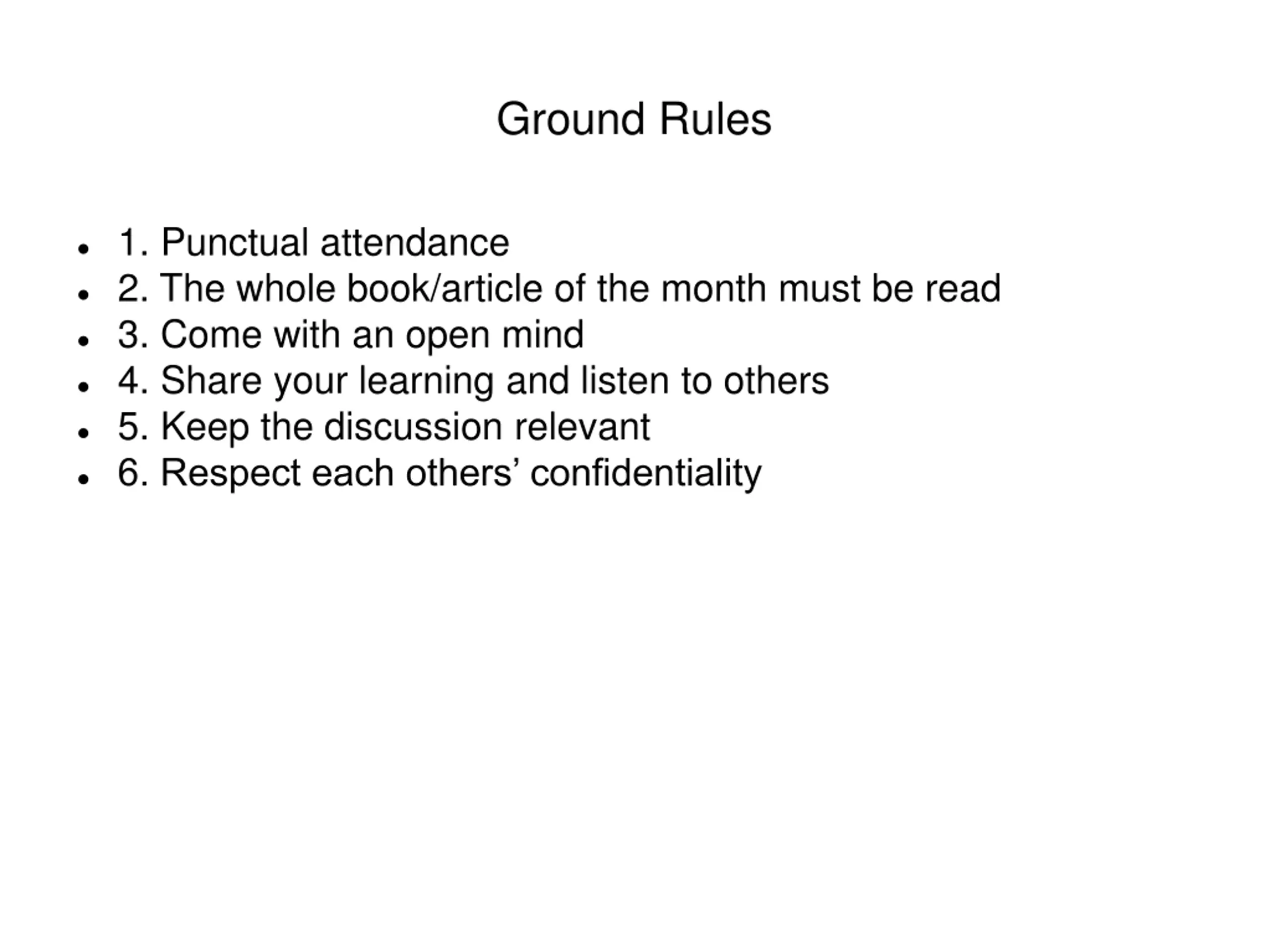 Ground Rules 1. Punctual attendance 2. The whole book/article of the month must be read 3. Come with an open mind 4. Share your learning and listen to others 5. Keep the discussion relevant 6. Respect each others confidentiality
