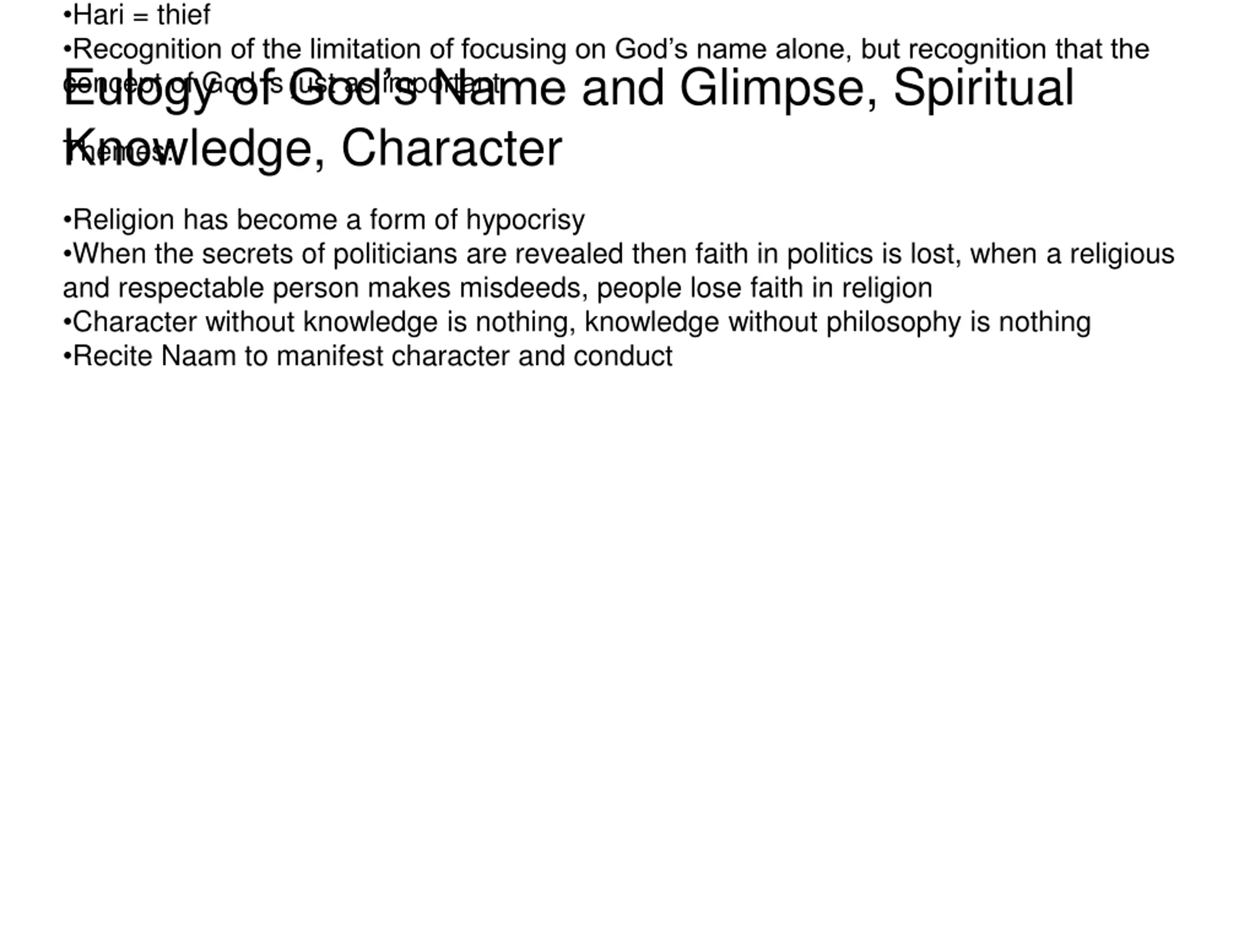 Hari = thief Recognition of the limitation of focusing on God s name alone, but recognition that the concept of God is just as important Eulogy of God s Name and Glimpse, Spiritual Knowledge, Character Themes: Religion has become a form of hypocrisy When the secrets of politicians are revealed then faith in politics is lost, when a religious and respectable person makes misdeeds, people lose faith in religion Character without knowledge is nothing, knowledge without philosophy is nothing Recite Naam to manifest character and conduct
