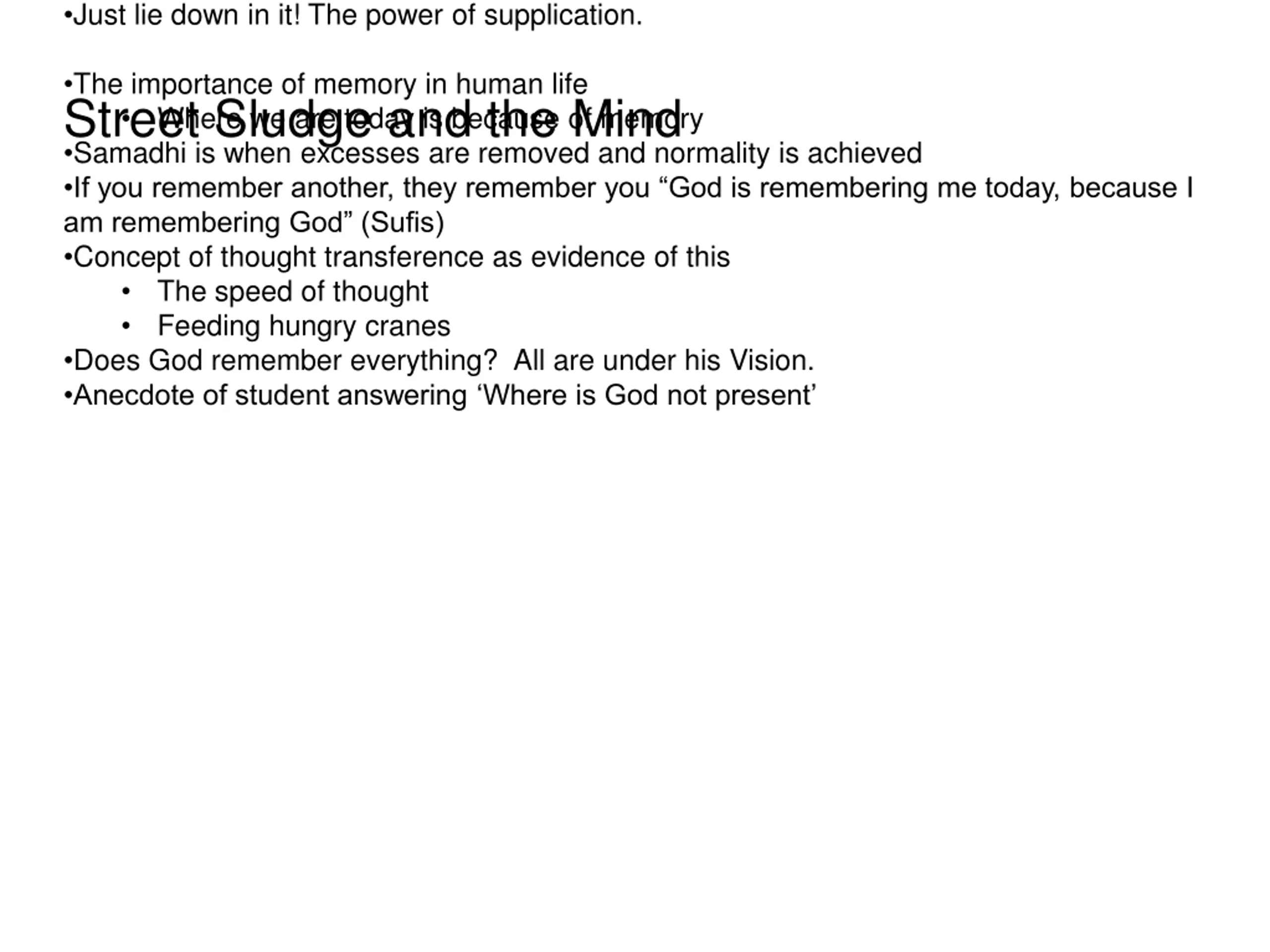 Just lie down in it! The power of supplication. The importance of memory in human life Where we are today is because of memory Street Sludge and the Mind Samadhi is when excesses are removed and normality is achieved If you remember another, they remember you God is remembering me today, because I am remembering God (Sufis) Concept of thought transference as evidence of this The speed of thought Feeding hungry cranes Does God remember everything? All are under his Vision. Anecdote of student answering Where is God not present