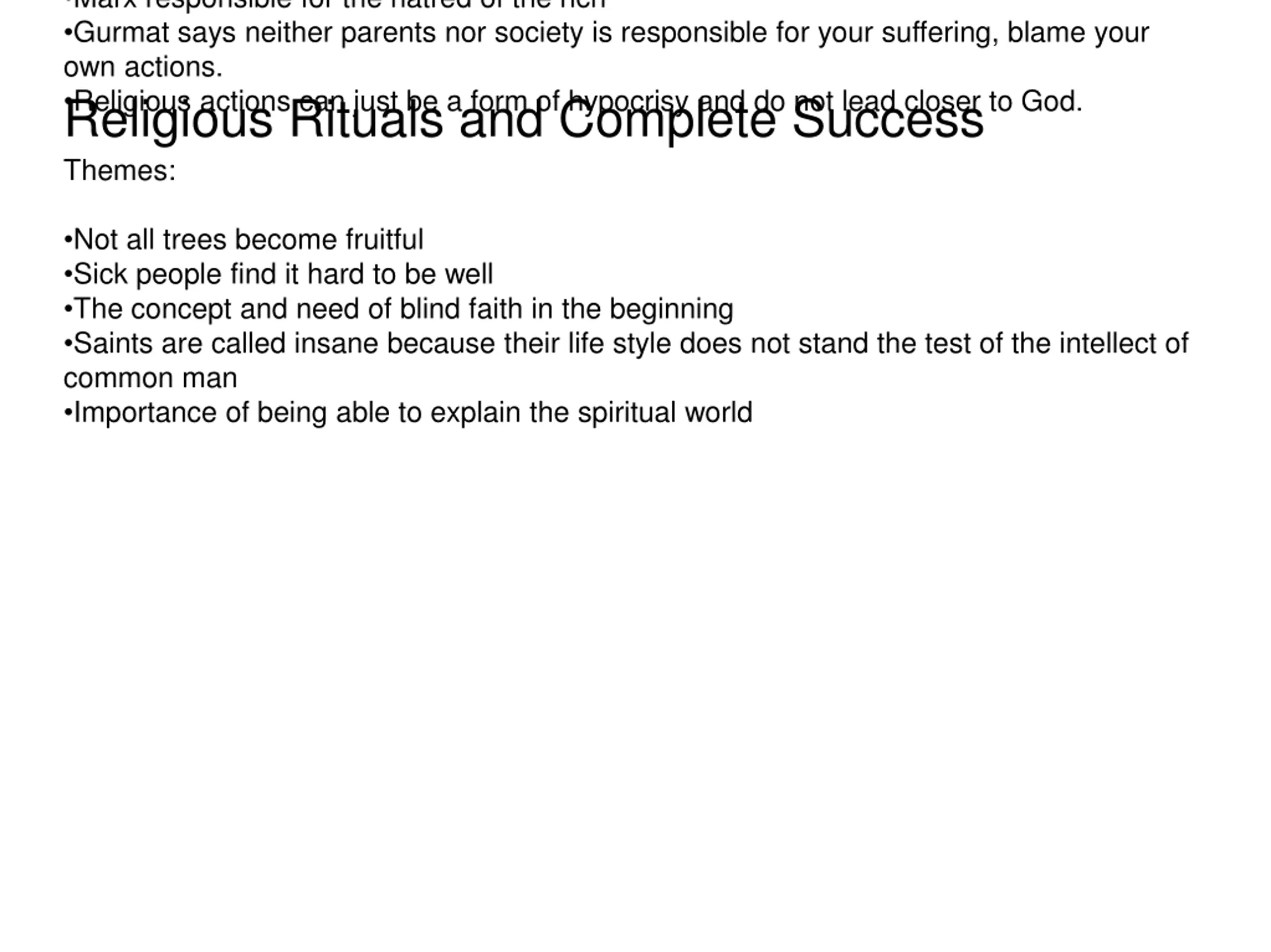 Marx responsible for the hatred of the rich Gurmat says neither parents nor society is responsible for your suffering, blame your own actions. Religious actions can just be a form of hypocrisy and do not lead closer to God. Religious Rituals and Complete Success Themes: Not all trees become fruitful Sick people find it hard to be well The concept and need of blind faith in the beginning Saints are called insane because their life style does not stand the test of the intellect of common man Importance of being able to explain the spiritual world
