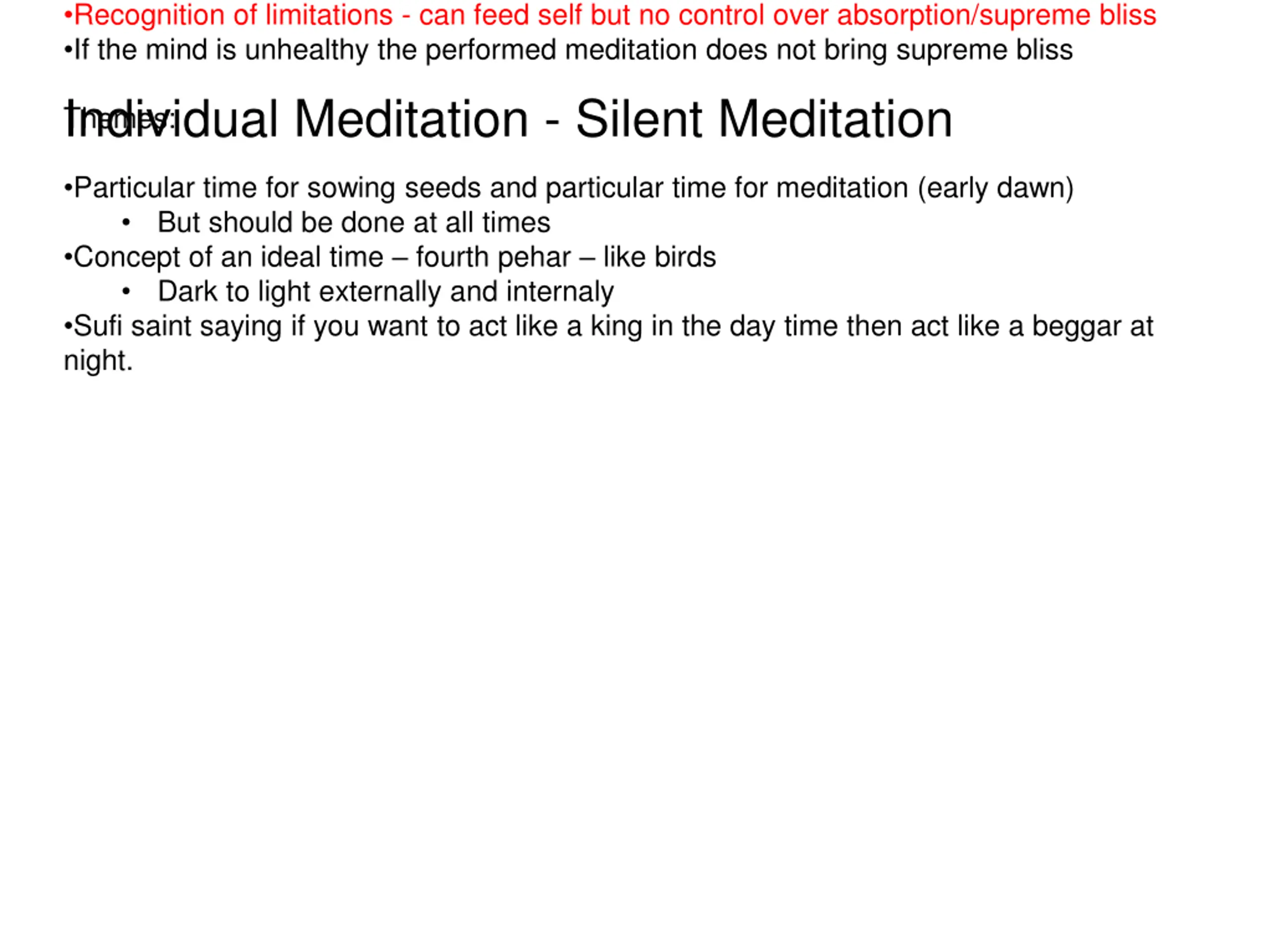 Recognition of limitations - can feed self but no control over absorption/supreme bliss If the mind is unhealthy the performed meditation does not bring supreme bliss Individual Meditation - Silent Meditation Themes: Particular time for sowing seeds and particular time for meditation (early dawn) But should be done at all times Concept of an ideal time fourth pehar like birds Dark to light externally and internaly Sufi saint saying if you want to act like a king in the day time then act like a beggar at night.