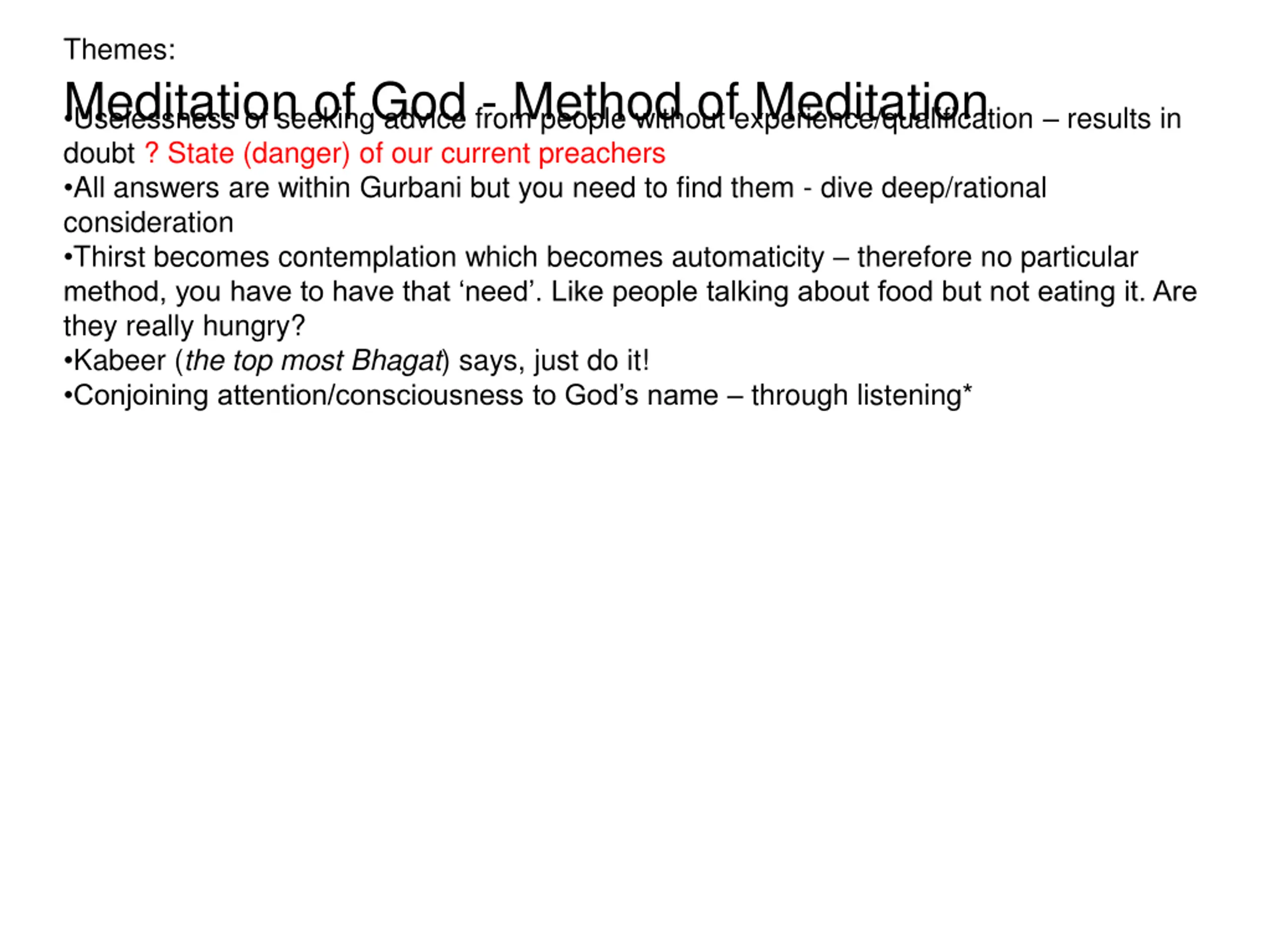Themes: Meditation of God - Method of Meditation Uselessness of seeking advice from people without experience/qualification results in doubt ? State (danger) of our current preachers All answers are within Gurbani but you need to find them - dive deep/rational consideration Thirst becomes contemplation which becomes automaticity therefore no particular method, you have to have that need . Like people talking about food but not eating it. Are they really hungry? Kabeer (the top most Bhagat) says, just do it! Conjoining attention/consciousness to God s name through listening*