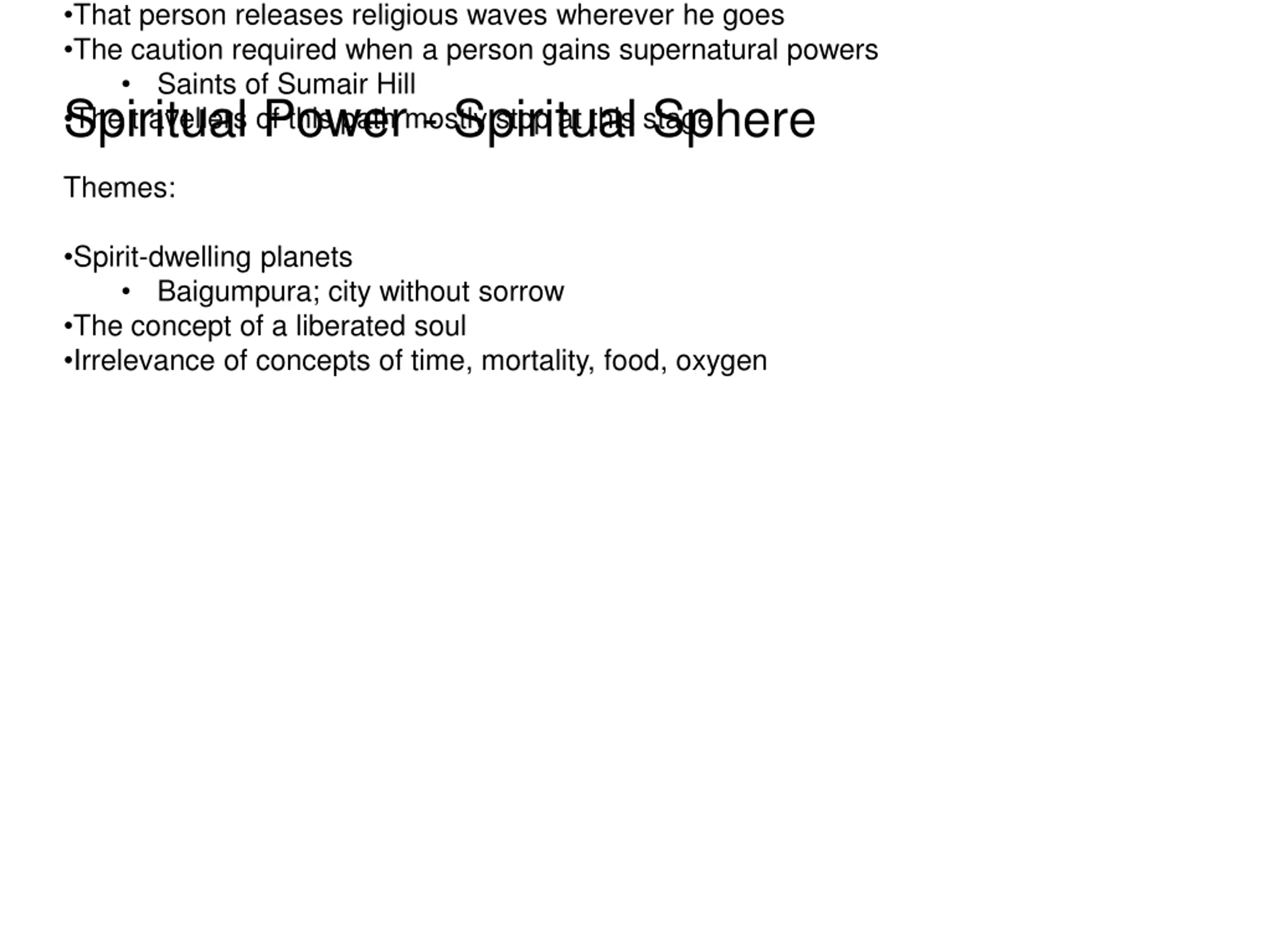 That person releases religious waves wherever he goes The caution required when a person gains supernatural powers Saints of Sumair Hill The travellers of this path mostly stop at this stage Spiritual Power - Spiritual Sphere Themes: Spirit-dwelling planets Baigumpura; city without sorrow The concept of a liberated soul Irrelevance of concepts of time, mortality, food, oxygen