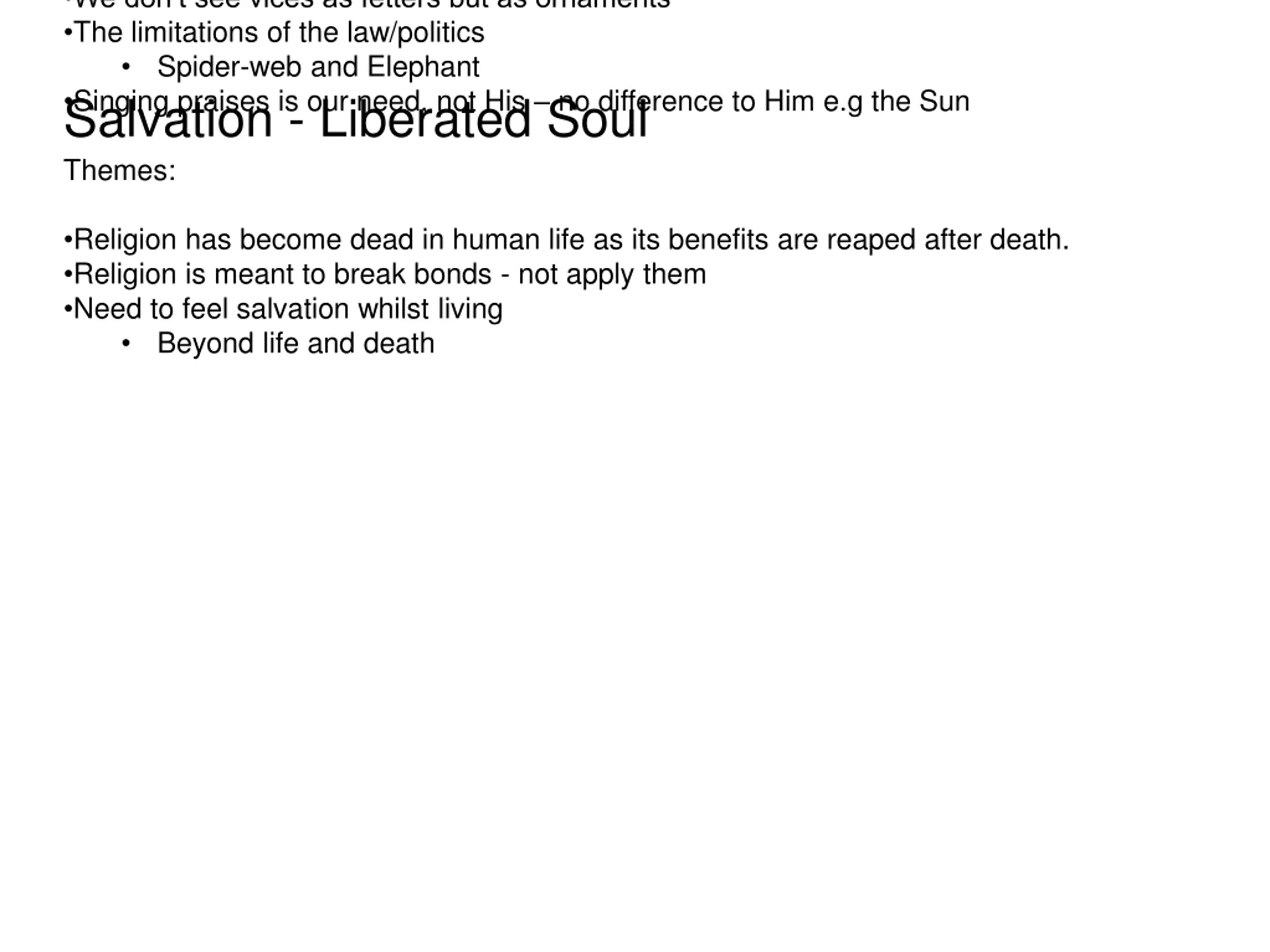 We dont see vices as fetters but as ornaments The limitations of the law/politics Spider-web and Elephant Singing praises is our need, not His no difference to Him e.g the Sun Salvation - Liberated Soul Themes: Religion has become dead in human life as its benefits are reaped after death. Religion is meant to break bonds - not apply them Need to feel salvation whilst living Beyond life and death