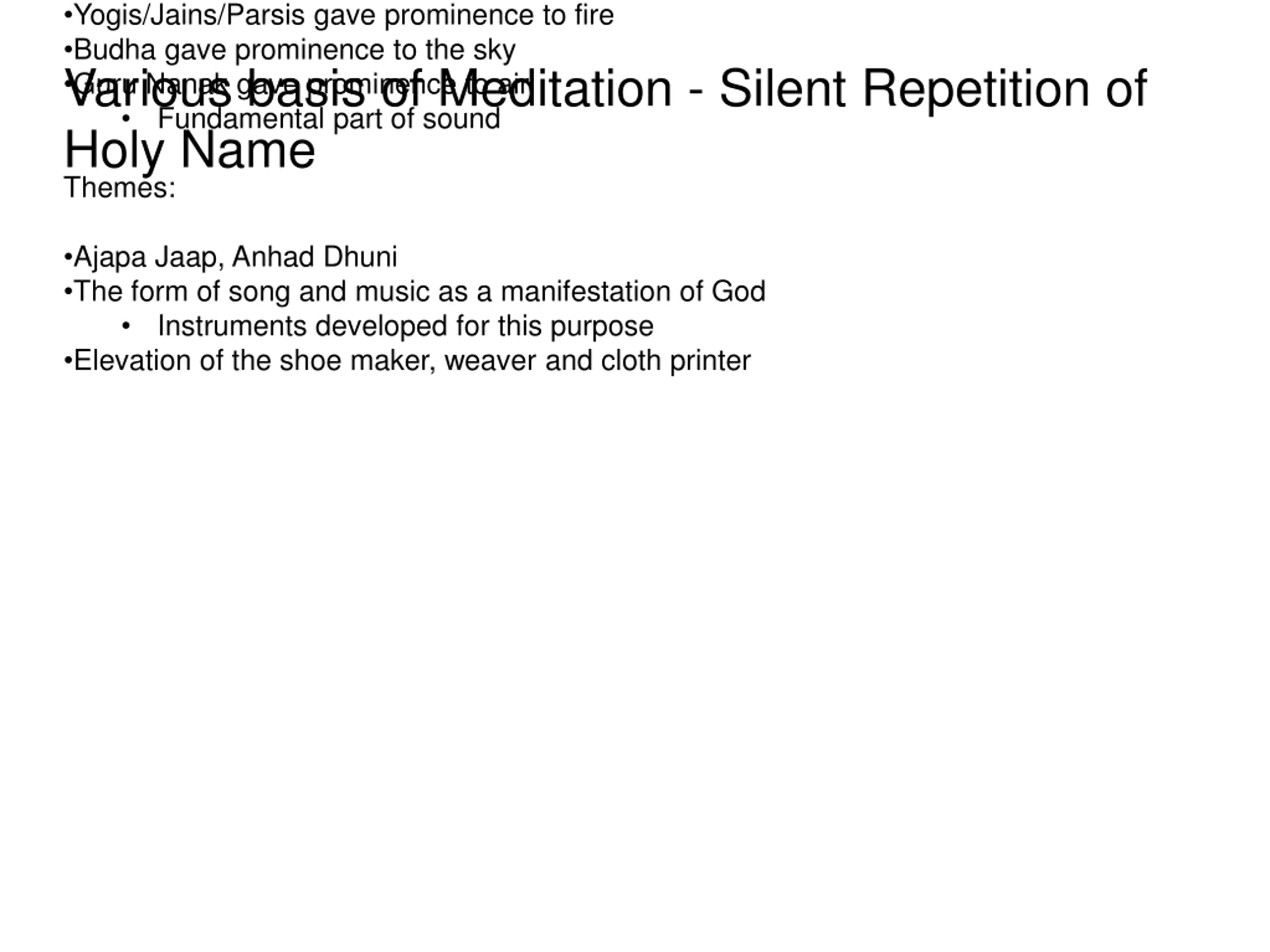 Yogis/Jains/Parsis gave prominence to fire Budha gave prominence to the sky Guru Nanak gave prominence to air Fundamental part of sound Various basis of Meditation - Silent Repetition of Holy Name Themes: Ajapa Jaap, Anhad Dhuni The form of song and music as a manifestation of God Instruments developed for this purpose Elevation of the shoe maker, weaver and cloth printer