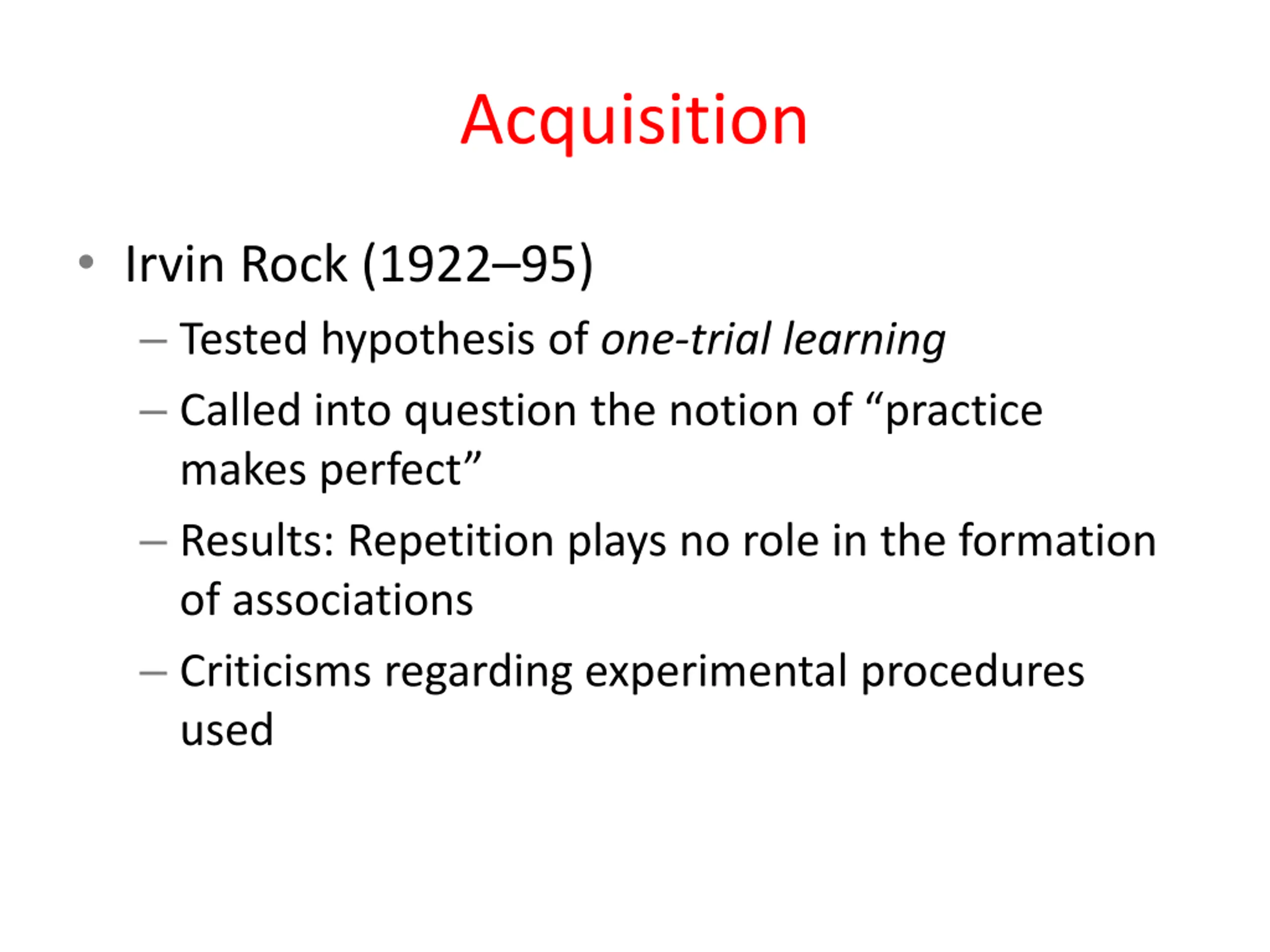 Acquisition Irvin Rock (1922 95) Tested hypothesis of one-trial learning Called into question the notion of practice makes perfect Results: Repetition plays no role in the formation of associations Criticisms regarding experimental procedures used