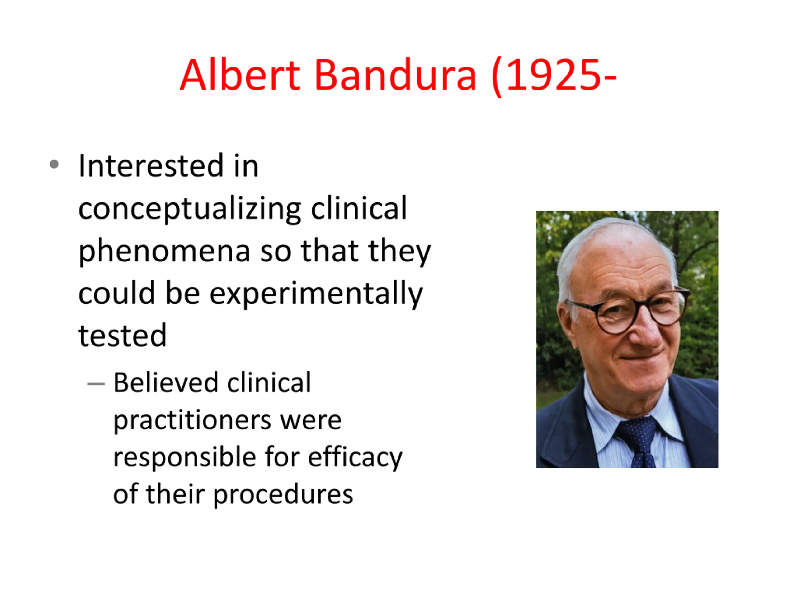 Albert Bandura (1925- Interested in conceptualizing clinical phenomena so that they could be experimentally tested Believed clinical practitioners were responsible for efficacy of their procedures