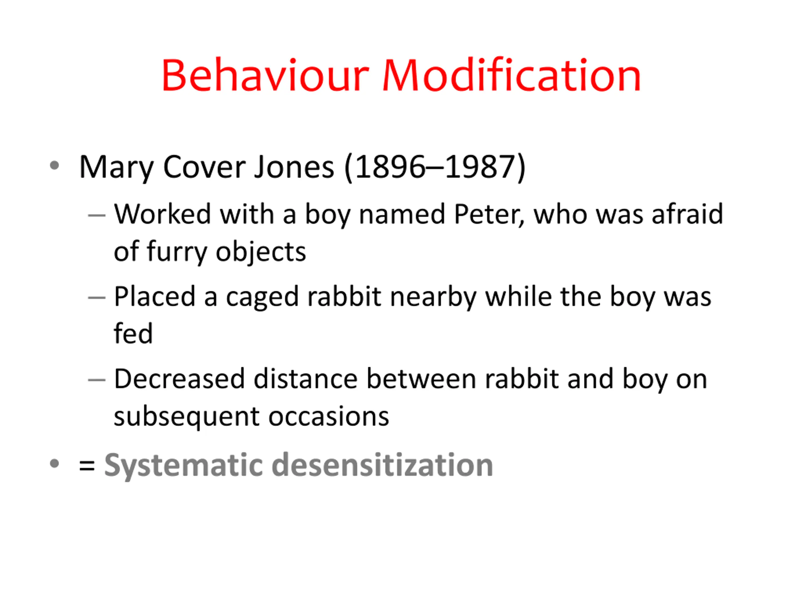 Behaviour Modification Mary Cover Jones (1896 1987) Worked with a boy named Peter, who was afraid of furry objects Placed a caged rabbit nearby while the boy was fed Decreased distance between rabbit and boy on subsequent occasions = Systematic desensitization