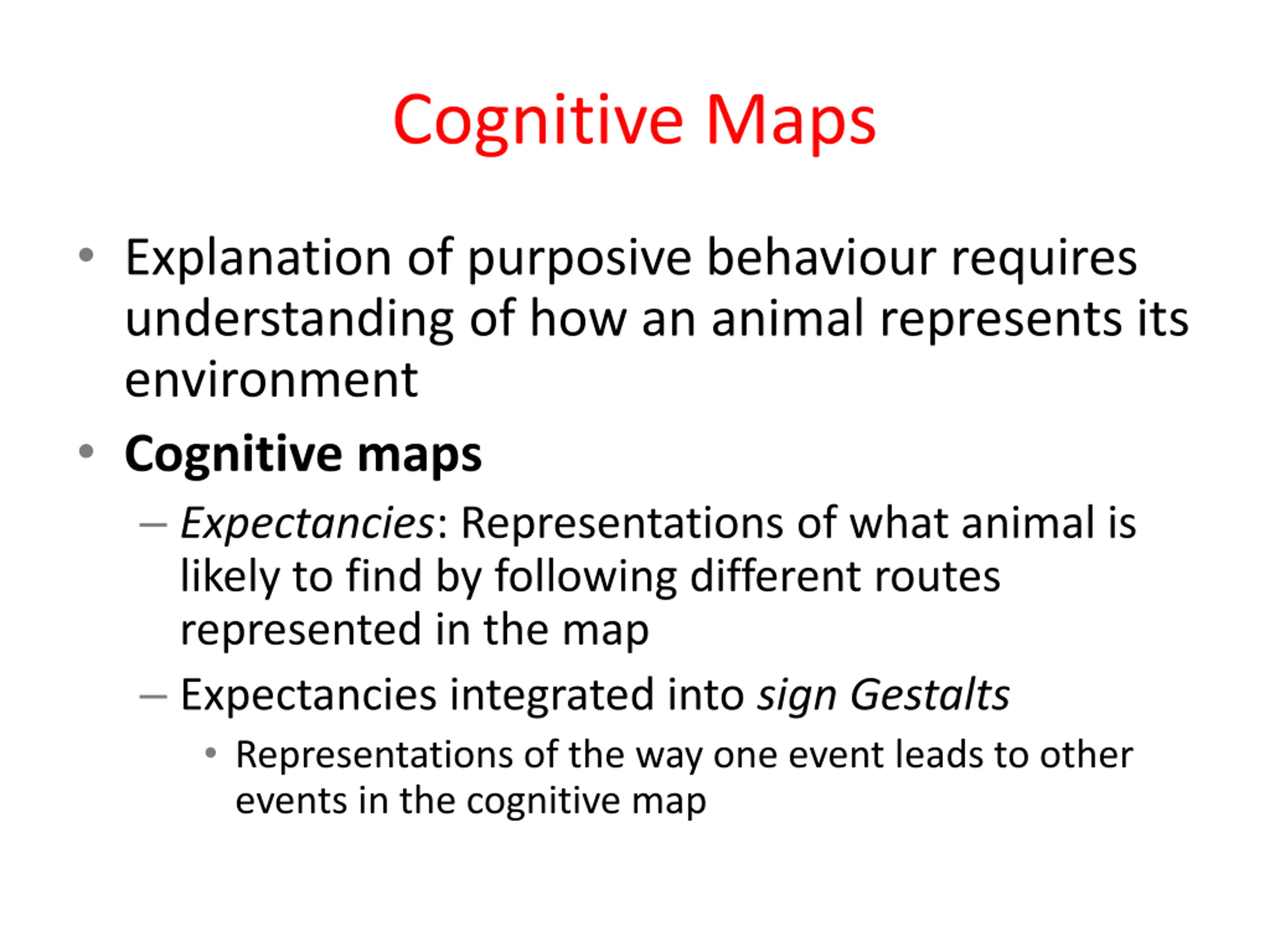 Cognitive Maps Explanation of purposive behaviour requires understanding of how an animal represents its environment Cognitive maps Expectancies: Representations of what animal is likely to find by following different routes represented in the map Expectancies integrated into sign Gestalts Representations of the way one event leads to other events in the cognitive map