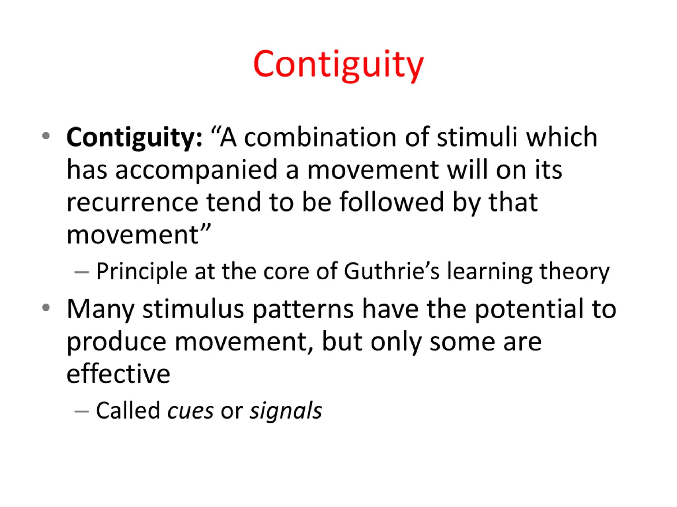 Contiguity Contiguity: A combination of stimuli which has accompanied a movement will on its recurrence tend to be followed by that movement Principle at the core of Guthrie s learning theory Many stimulus patterns have the potential to produce movement, but only some are effective Called cues or signals