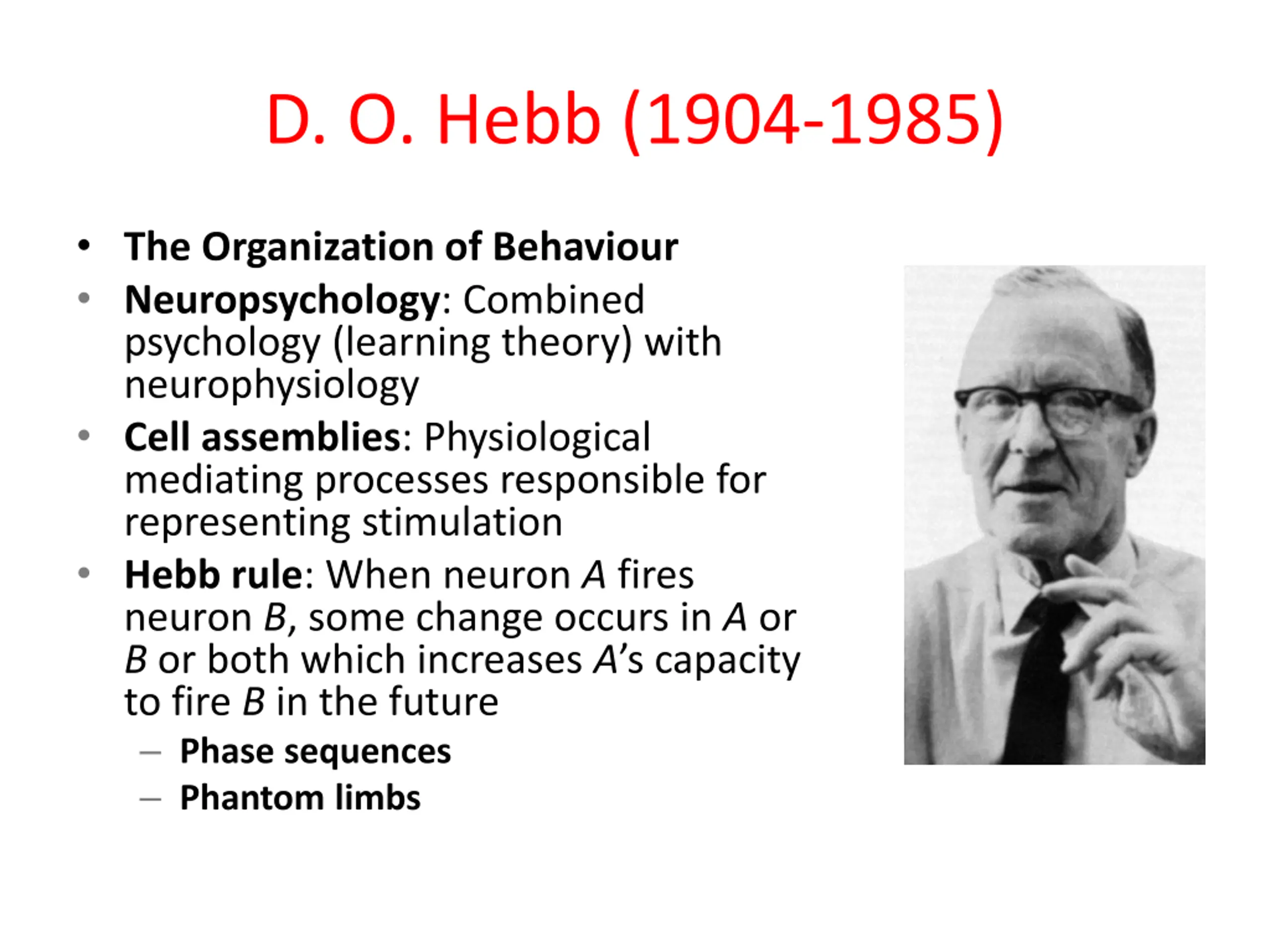 D. O. Hebb (1904-1985) The Organization of Behaviour Neuropsychology: Combined psychology (learning theory) with neurophysiology Cell assemblies: Physiological mediating processes responsible for representing stimulation Hebb rule: When neuron A fires neuron B, some change occurs in A or B or both which increases A s capacity to fire B in the future Phase sequences Phantom limbs