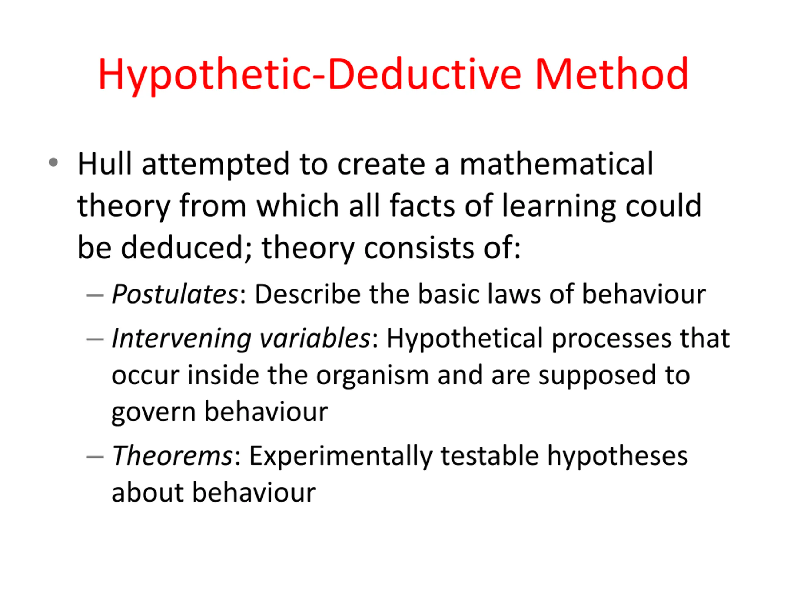 Hypothetic-Deductive Method Hull attempted to create a mathematical theory from which all facts of learning could be deduced; theory consists of: Postulates: Describe the basic laws of behaviour Intervening variables: Hypothetical processes that occur inside the organism and are supposed to govern behaviour Theorems: Experimentally testable hypotheses about behaviour