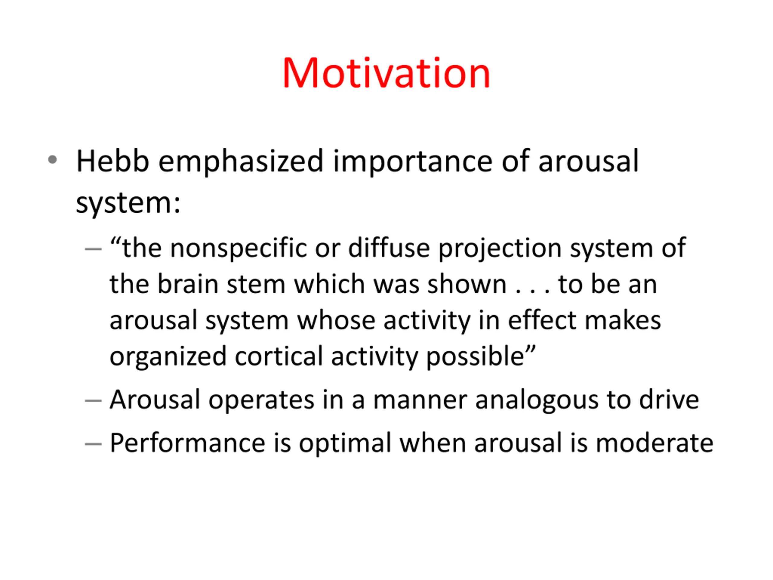 Motivation Hebb emphasized importance of arousal system: the nonspecific or diffuse projection system of the brain stem which was shown . . . to be an arousal system whose activity in effect makes organized cortical activity possible Arousal operates in a manner analogous to drive Performance is optimal when arousal is moderate