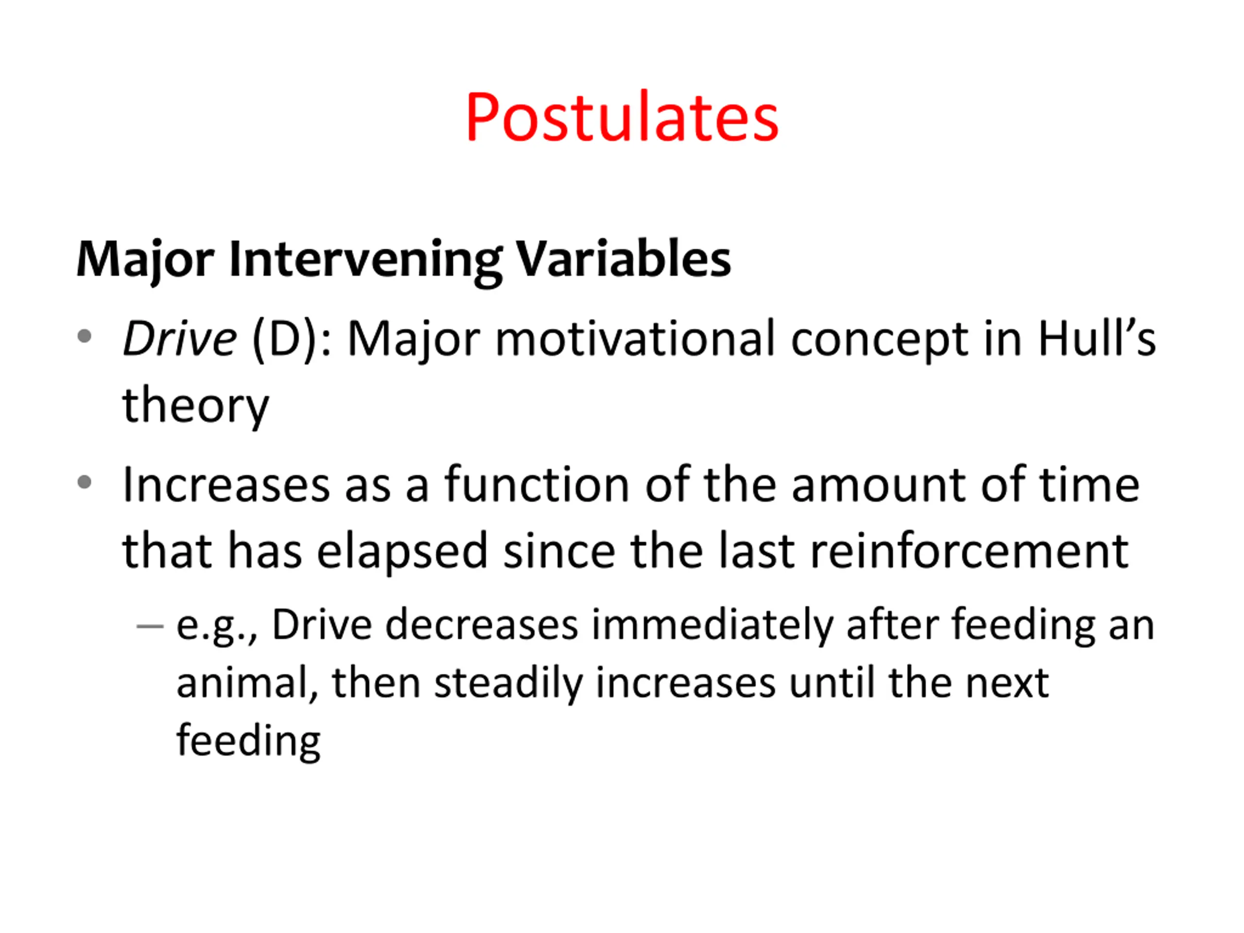 Postulates Major Intervening Variables Drive (D): Major motivational concept in Hull s theory Increases as a function of the amount of time that has elapsed since the last reinforcement e.g., Drive decreases immediately after feeding an animal, then steadily increases until the next feeding