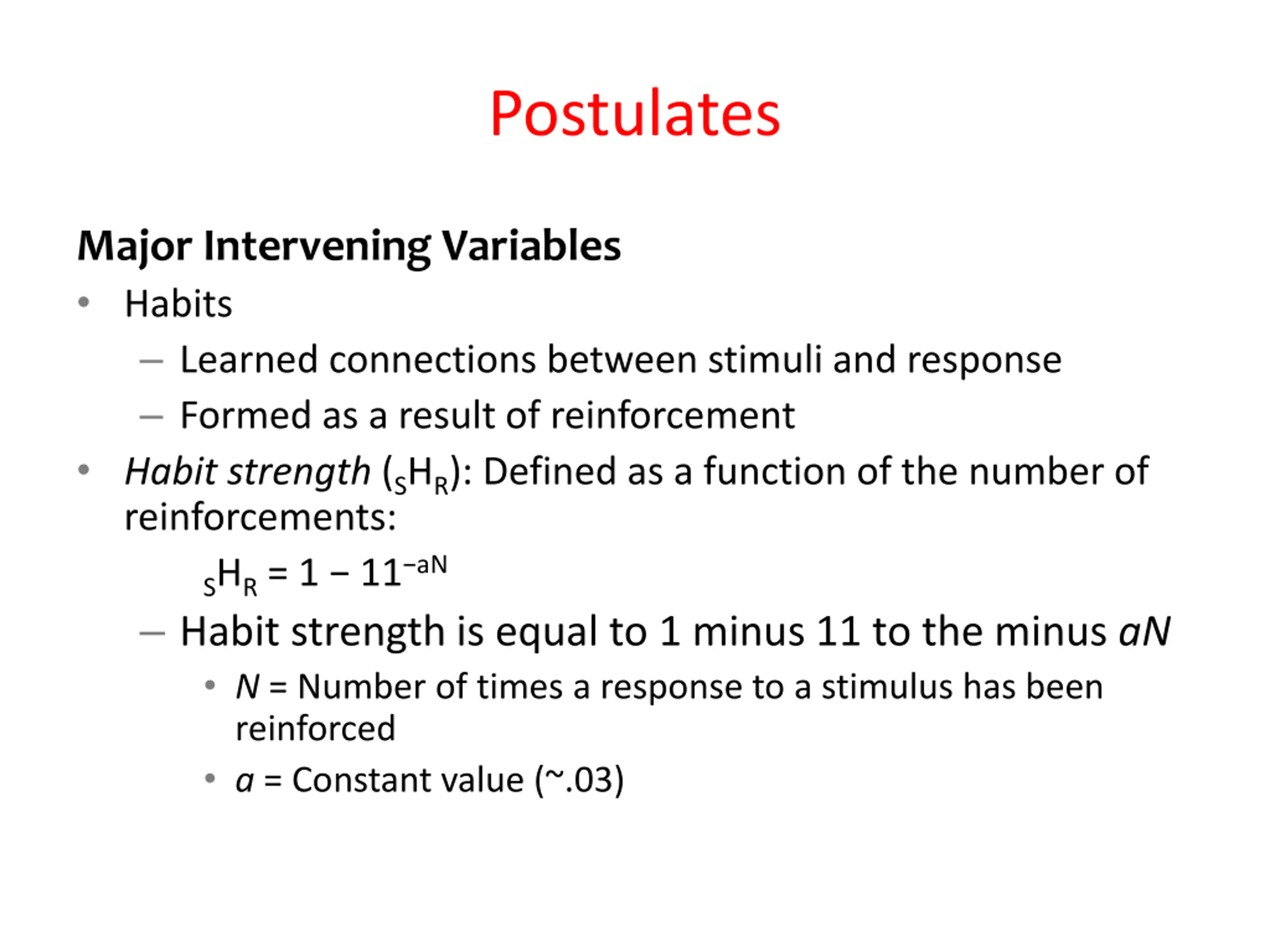 Postulates Major Intervening Variables Habits Learned connections between stimuli and response Formed as a result of reinforcement Habit strength (SHR): Defined as a function of the number of reinforcements: SHR= 1 11 aN Habit strength is equal to 1 minus 11 to the minus aN N = Number of times a response to a stimulus has been reinforced a = Constant value (~.03)