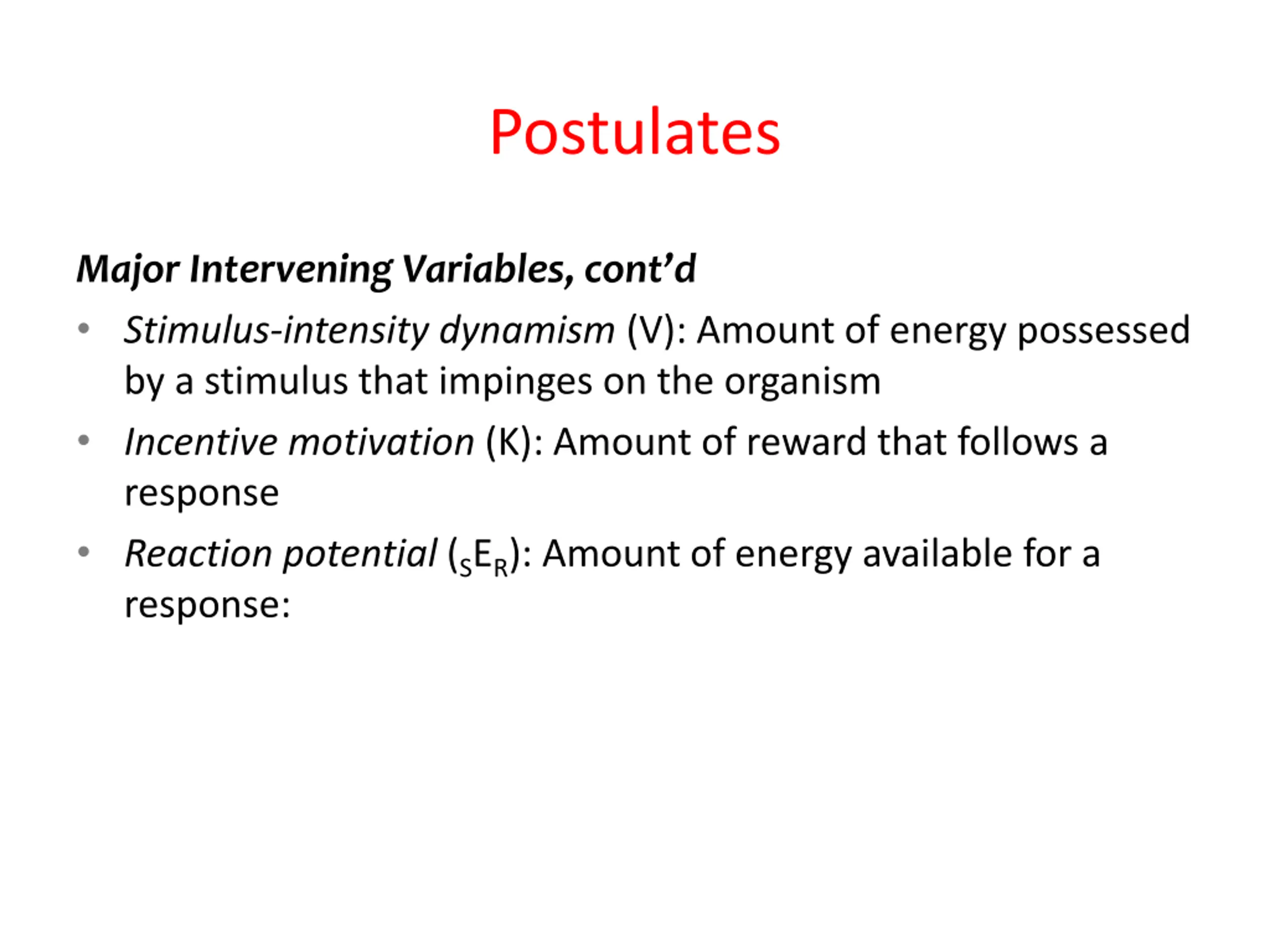 Postulates Major Intervening Variables, cont d Stimulus-intensity dynamism (V): Amount of energy possessed by a stimulus that impinges on the organism Incentive motivation (K): Amount of reward that follows a response Reaction potential (SER): Amount of energy available for a response: