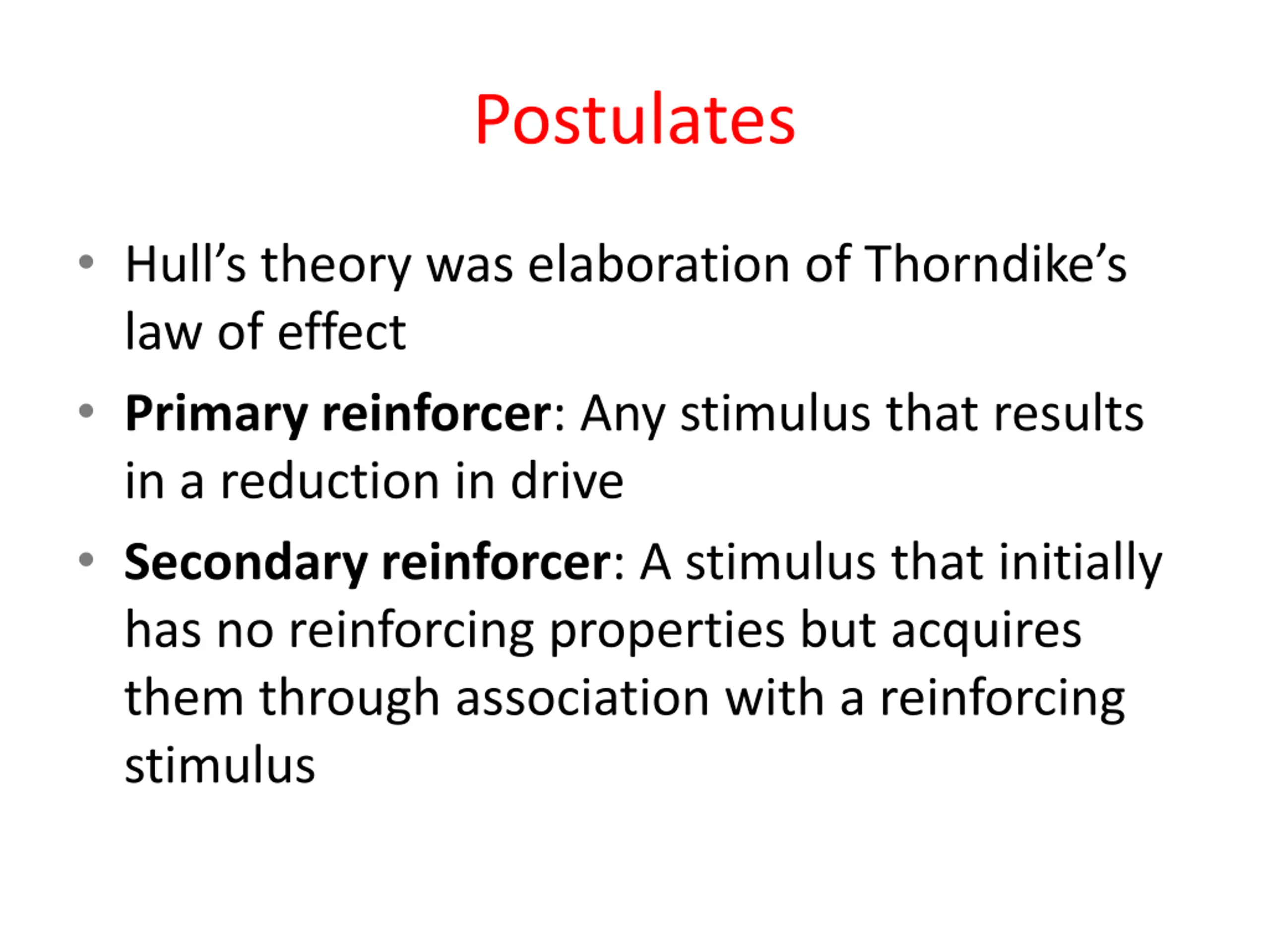 Postulates Hull s theory was elaboration of Thorndike s law of effect Primary reinforcer: Any stimulus that results in a reduction in drive Secondary reinforcer: A stimulus that initially has no reinforcing properties but acquires them through association with a reinforcing stimulus
