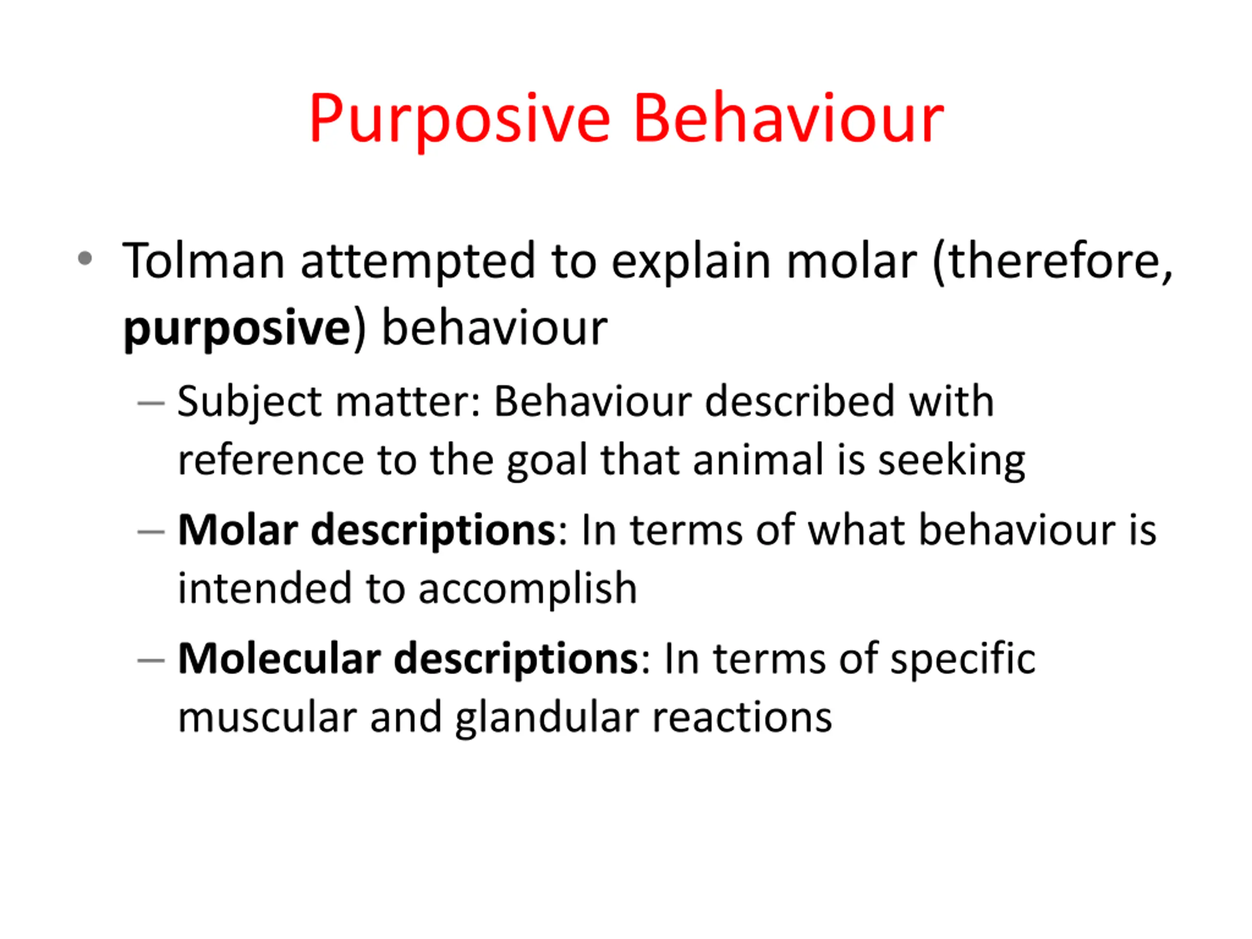 Purposive Behaviour Tolman attempted to explain molar (therefore, purposive) behaviour Subject matter: Behaviour described with reference to the goal that animal is seeking Molar descriptions: In terms of what behaviour is intended to accomplish Molecular descriptions: In terms of specific muscular and glandular reactions