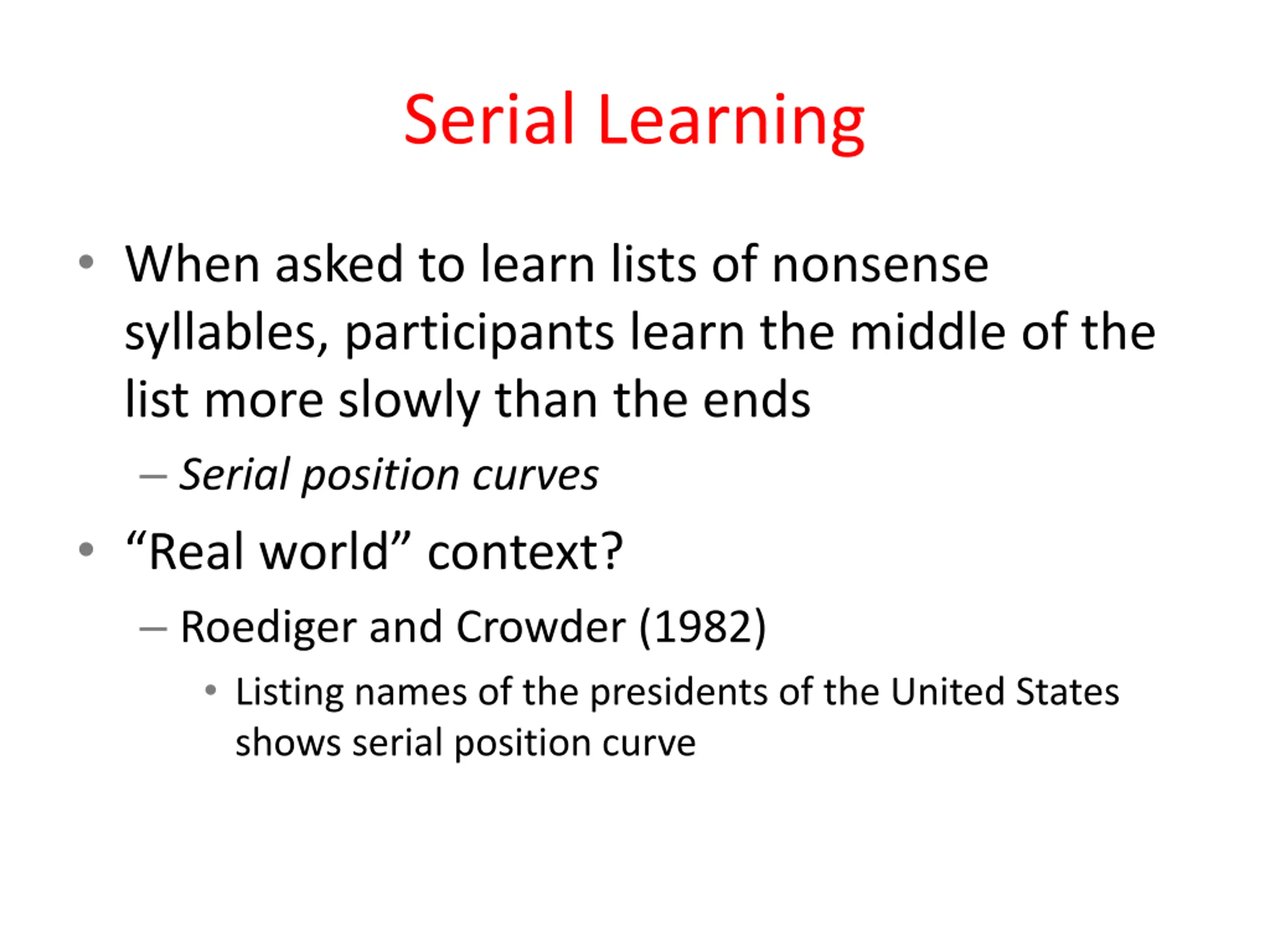 Serial Learning When asked to learn lists of nonsense syllables, participants learn the middle of the list more slowly than the ends Serial position curves Real world context? Roediger and Crowder (1982) Listing names of the presidents of the United States shows serial position curve